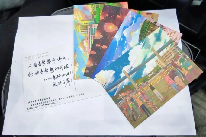 2022年11月26日上午,万象城awc官网登录入口学生党员开展“暖心祝福,艺研为定”活动,每位党员将自己的祝福语写在精美的贺卡上,“星光不负赶路人,你定会在清晨的读书声里和深夜的灯光下,实现自己的梦想。”一笔一划,一字一句,明信片虽小,但每一张祝福语都承载着党员们以及美院师生们对考研同学的深深关切,相信美院备考同学们带着师生们的祝福,一战上岸!