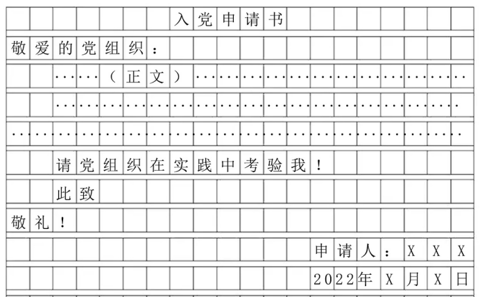 申请入党的同志要由本人向党组织正式递交书面申请。入党申请书一般包括以下基本内容:标题:入党申请书【居中】称谓:敬爱的党组织【顶格】正文:(一)主要写自己对党的认识和入党动机,表明自己的入党愿望;(二)介绍本人基本情况,成长经历,受何种奖励和处分,以及思想、工作、学习、作风等方面的情况;(三)对待入党的态度和决心,今后的努力方向和如何以实际行动争取早日加入党组织。结尾:一般以“请党组织在实践中考验我”或“请党组织看我的实际行动”结束正文。以“此致,敬礼!”结束全文,“此致”空两格,“敬礼”换行顶格,感叹号。署名和日期:落款居右写上申请人的姓名,换行注明申请的日期(日期要精确到日)