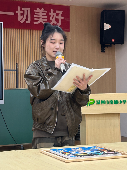 最后是由实习生代表杨铭同学发言,她对给予此次实习实践锻炼机会的南浦小学和在课程准备期间给予帮助的指导老师们表达了真挚的感谢。并承诺在校期间会认真地向各位老师学习,工作负责,对学生关心爱护并积极参加学校组织的各项活动,遵守学校的一切规章制度,严格律己。