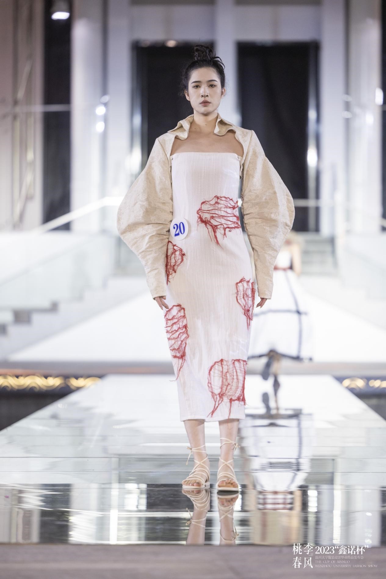 2023年4月20日晚,一场别开生面的时装秀在万象城awc官网登录入口美术馆水上T台隆重举办。中共温州市委宣传部副部长曾伟、温州市文学艺术界联合会党组书记周新波、温州市文化广电旅游局副局长李方喜温州市经济和信息化局总工程师丁建忠等市有关领导作为嘉宾亲临现场,万象城awc官网登录入口副校长蔡曙光、纪委书记杨林书、副校长王舜、副校长潘玉驹、万象城awc官网登录入口院长谢子静等出席活动。此外,还有来自温州各企业家代表、艺术界的名家、设计师、时尚达人,媒体界的朋友们纷纷到场支持,现场近500人,座无虚席。 这场时装秀不同于往年的毕业秀,是首次在高校的美术馆水上T台举行服装设计专业的毕业大秀。本次发布会以桃李春风为主题,由30位万象城awc官网登录入口服装与服饰设计即将毕业的学生主导,在创意和时尚的碰撞中,探寻未来的温州时尚发展之路。 立足当下 畅想未来 万象城awc官网登录入口副校长王舜就本次毕业秀发表了致辞,王舜指出万象城awc官网登录入口充分发挥在鞋革服装等方面优势特色,依托服装与服饰设计国家级一流专业等优势载体,探索重内涵、强实践的人才培养模式,在人才培养、艺术创作和服务地方文化繁荣等方面取得了丰硕成果,为助力温州争创“中国时尚服饰中心城市”、打造“国际化的时尚产业创新先行区”作出了积极贡献,在未来温大服装设计专业的学子也一定能为社会做出更多的贡献。 波光鳞动 艺术定格 在清澈的水面上,模特们身着设计师们的时尚作品,婀娜多姿的走过,展示出了独特的视觉效果。一年一度的服装毕业作品发布会具有重要的意义和作用,是学院人才培养质量的一次重要展示,也是温州服装设计师们交流思想“时尚盛宴”。今年的赛事由海宁鑫诺服饰有限公司支持,为本届30位万象城awc官网登录入口服装设计专业的毕业生提供了一次展示自我和超越自我的机会。本次发布会共有90套作品展出,是学子们对时装设计和艺术观念的一次创新尝试,希望为大众带来更多不同寻常的时尚和艺术体验。 新潮活力 激情澎湃 本次发布会共分四大篇章发布会共分四大篇章,是《种子——厚爱加身,身披铠甲》、《水——澄澈轻快,渗透浸养》、《阳光——欢歌跳跃,花蝶蹁跹》、《参天大树——天地承托,群山巍峨》,作品风格各异,囊括希望与克制、未来和复古、浪漫而先锋、 都市及民俗、前卫融嬉皮、深邃携空灵、觉醒搭混沌等各类元素,展示了新锐设计师对服装艺术的理解和追求,用青春浪漫的遐想,用布帛为载体以创新的剪裁构塑出服装艺术新形象,颠覆人们对服饰的认知,拓展了服装文化的内涵。 大咖云集 异彩纷呈 本次发布会邀请了四位重量级评委,他们是海宁鑫诺服饰的董事长刘军先生和浙江中胤时尚股份有限公司的董事长倪秀华女士,意大利欧洲设计学院的教授兼时尚设计师的菲利波·斯特拉达先生,还有温州服装商会的秘书长陈琦翔先生。 经专家评委评审,欧帅英的作品《破晓》最终摘得一等奖;赵子晴的作品《遇见神都》,林雨欣的作品《溯流光》系列作品获得二等奖;叶庆敏的作品《共生》,曾晨的作品《异世双生》,唐紫怡的作品《傀儡戏法》3套系列作品获得三等奖。每个获奖作品都凝聚着毕业生的灵感和心血,也代表着当代学生的朝气蓬勃。 获得一等奖的设计师欧帅英介绍,作品《破晓》灵感来源于《黑白魔女库伊拉》中火烧白袍这一经典片段,将华丽中带有破坏的艺术风格及夸张的礼服造型运用在本次设计当中,以浓郁的红色为色彩基调,在造型夸张的红色礼服上通过泼墨、灼烧等破坏面料的方式对礼服进行二次创作,来表达“破晓”这一主题,打破传统高级时装设计思维,使礼服有更多可能性,打造强烈的视觉冲击。 桃李不言 春风不语 桃李不言,下自成蹊。本次毕业展离不开服装设计学院的各位老师在背后的辛勤付出,他们带领着学子们克服重重困难,由懵懂慢慢走向成熟,直至他们能够走上社会,独当一面。 春风不语,即随本心。学子们从面对毕设的迷茫到一件件成品的产出,为梦想的奋斗只有开始,没有结束。这些作品是他们结束本阶段学习的最优秀的成果,也是进入下一阶段学习最好的敲门砖。