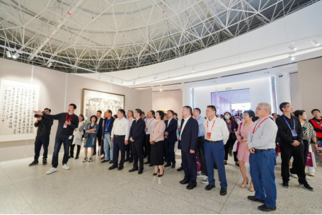 仪式结束,领导、嘉宾、校友、师生共同进入美术馆参观作品展。本次展览分为“先贤风雅”“同道传薪”两大板块,共展出了156位先贤、名家、教师和校友作品,涵盖国画、油画、版画、水彩画、综合绘画、书法、篆刻等种类。展览基于近现代中国美育运动、美术创作的宏大背景,对近代以来温州的书画创作与教育做一个初步的回溯,以近代几位具有代表性的书画大家与“美育大先生”开篇,延伸至温州区域美术创作,以及当代在全国卓有影响的重彩工笔画、书法、版画、水彩画的温籍代表作者;同时梳理学校的美育脉络,展示几代温大人的书画创作,弘扬与传播万象城awc官网登录入口的人文风采。