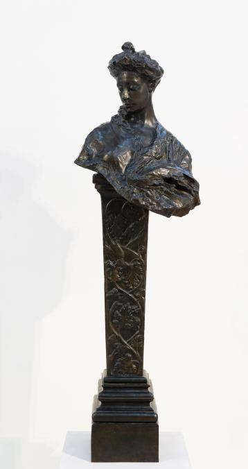 《柱子上的女人半身像》中的女性是费奈耶夫人。费奈耶夫人是罗丹大赞助人之一费奈耶先生的妻子,罗丹为她做的胸像体现罗丹在整合头像和底座方面的大胆尝试,而这也是他在阿尔玛馆展览的主要关注点。罗丹尝试将头像放置在不同高度的底座或圆柱上。通过这样的搭配,装饰有树叶和藤叶的底座彻底改变“费奈耶夫人”的视觉效果,她的头略微抬起,身上的披肩随意搭着,这种视角让雕像与观众产生距离感,就好像她无法接近一样。罗丹为费奈耶夫人制作了不同材质及不同版本的胸像和头像,如石膏版本或大理石版本。在不同的版本中,费奈耶夫人姿势都很相似,微微地侧着头,双眼微闭,十分优雅。费奈耶先生是19世纪末非常成功的实业家,也热爱收藏艺术品,是法兰西艺术学院会员,他对罗丹的作品情有独钟。在罗丹有些作品因为太过于现代而引起评论界的轩然大波时,费奈耶先生也会站出来公然表示对罗丹的支持。罗丹赠予费奈耶先生几个胸像版本,其它版本现藏于奥赛美术馆及罗丹博物馆。