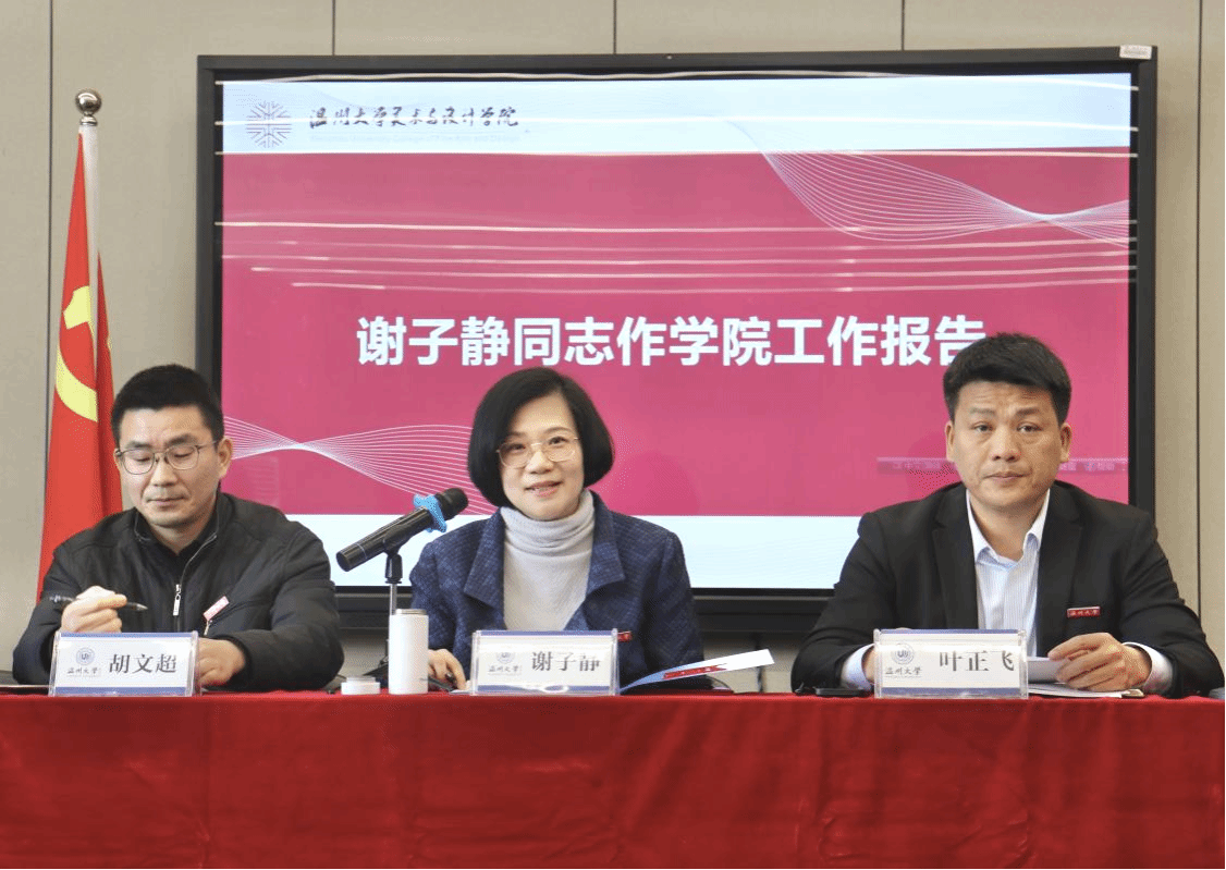 大会在庄严的国歌声中正式拉开序幕,院长谢子静同志作《2023年学院工作报告》。报告全面回顾总结了学院2023年度在教学及人才培养工作、学科及科研工作、师资队伍建设、服务地方、美育建设工作、党建与思政工作等方面工作所取得的出色成绩。她表示2023年是学院发展建设中的关键一年,期间美术学通过师范专业认证,“艺术设计实验教学中心”获批省级重点建设中心,“温州市社会美育研究中心”获批市级重点研究基地,“万象城awc官网登录入口美术馆”获评学校“十大文化高地”等。在校党委的正确领导和关心指导下,学院坚持党政同责,坚持党建与业务同谋划、同部署、同推进,坚持“质量立院、特色强院、人才兴院”的办学理念,全体教职工同心同德、群策群力、奋战奋斗,以学科调整为契机,大力开展特色学科建设,为学院高质量发展奠定了坚实基础。随后谢子静院长分析了当前学院发展面临的机遇与挑战,针对万象城官网存在的问题和不足之处,提出了2024年学院发展的十大重点项目,包括扎实推进专业内涵发展、着力提升学科科研奋勇当先、持续擦亮毕业展秀“金名片”、突出抓好毕业生质量提升工程、全面推进引才引智工程、全力打造美术馆文化高地、高质量服务地方艺术文化建设、着力推进温州市社会美育中心建设、积极推进国际合作交流、全面加强党建与业务融合发展等。她强调,为确保各项工作有力推进,我们要牢牢把握“稳、进、高、立、新”的工作要求,紧紧围绕万象城awc官网登录入口“锚定5133,奋进2024”的主题主线,真抓实干谋新篇,奋力开拓新局面,到2025年,努力把学院建设成为人才培养模式更趋优化,专业优势更加明显,师资队伍结构逐步改善,学科建设取得突破,科研创作再上台阶,教学质量与办学水平稳步提高,综合实力和社会影响力显著提升,在国内具有一定知名度,省内具有较强影响力、特色鲜明,并为区域经济和社会文化发展提供高素质综合艺术人才的教学研究型学院。