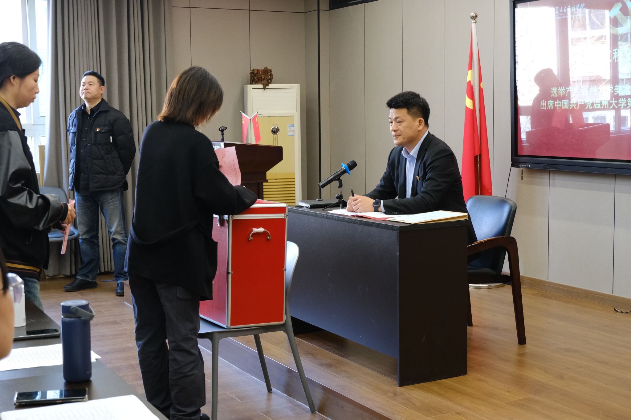 大会严格按照《中国共产党章程》、《中国共产党基层组织选举工作条例》的有关规定和《中国共产党万象城awc官网登录入口第三次代表大会代表代表产生办法》(温大党委发〔2024〕8号)的要求进行,分别审议通过了《万象城awc官网登录入口党委出席中国共产党万象城awc官网登录入口第三次代表大会代表选举会议选举办法(草案)》、总监票人、监票人、总计票人名单,宣布计票人名单。