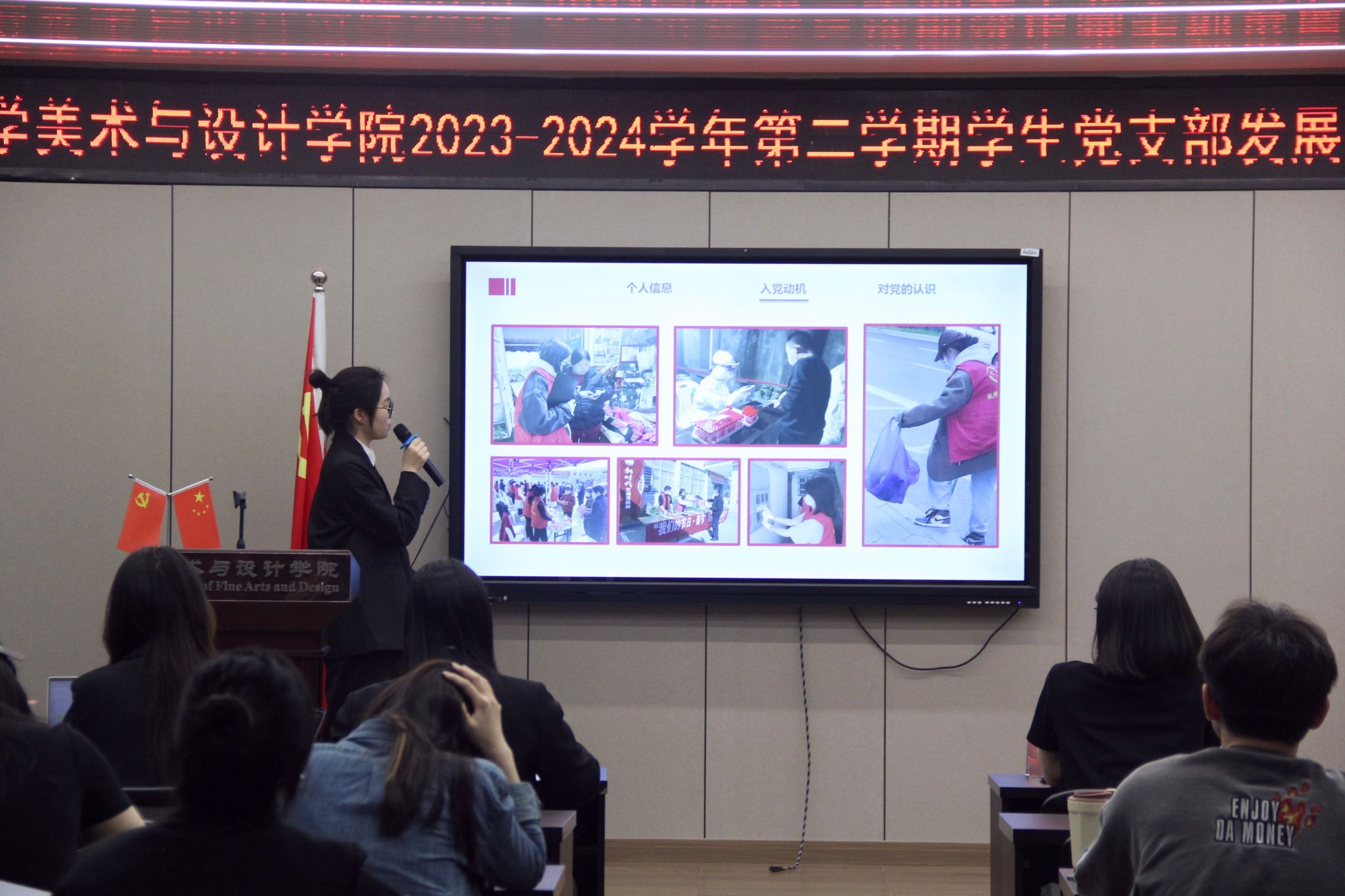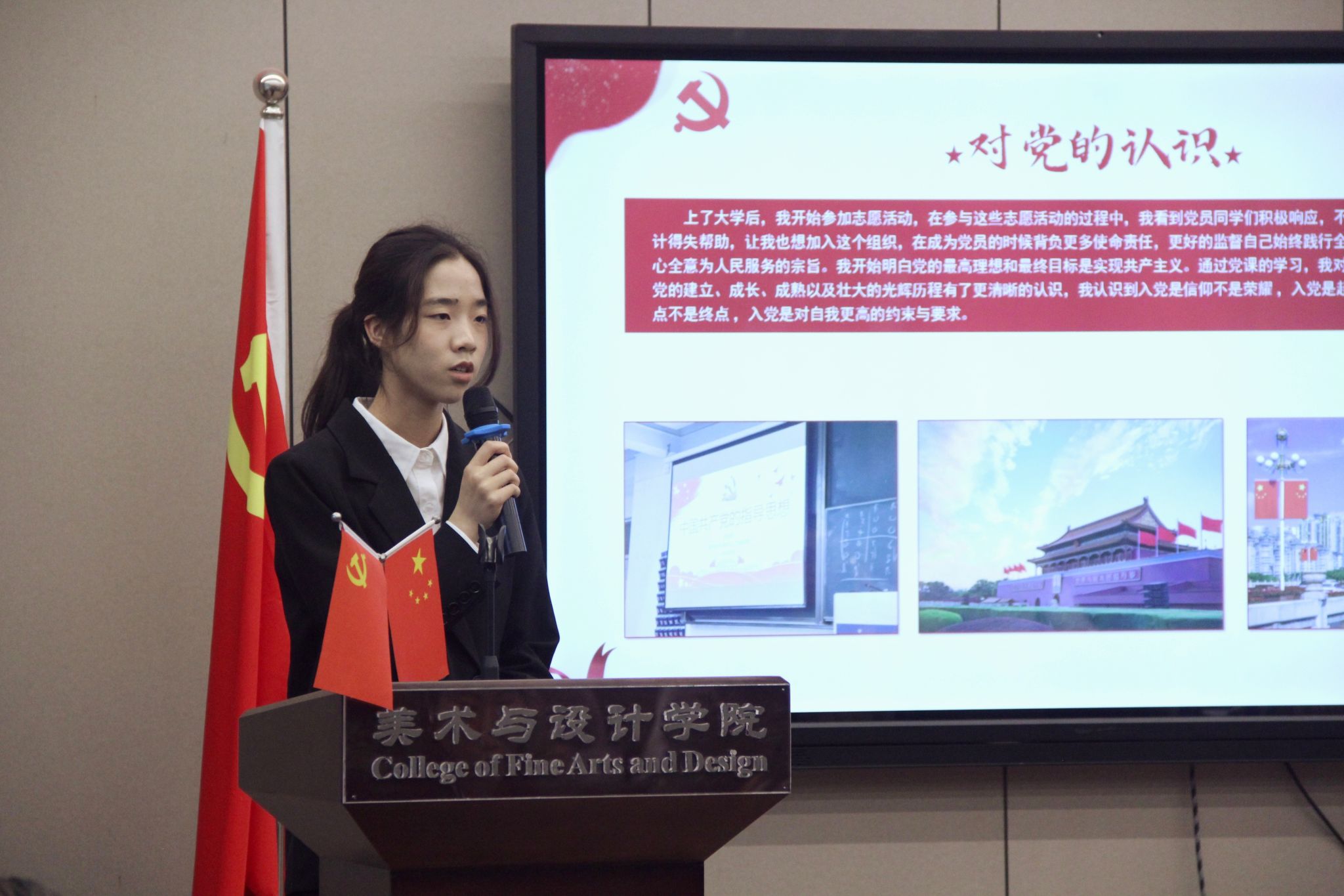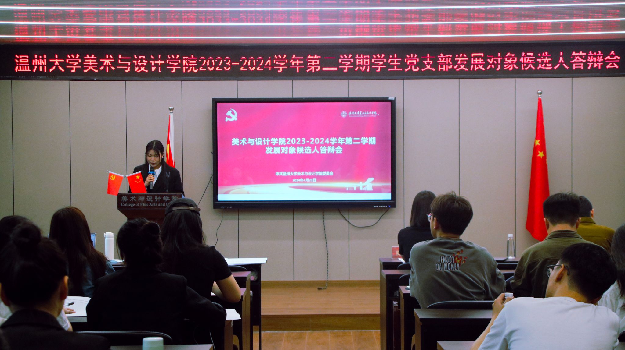 会议伊始,学生第三党支部党员汤佩遥同志进行答辩前汇报,宣布本次答辩会的议程和相关要求。51位发展对象候选人依次根据ppt讲述自己被列为入党积极分予以来的思想、学习、工作、生活等方面的情况以及自身存在的不足与问题,汇报对党的认识,入党动机,以及今后的努力方向。