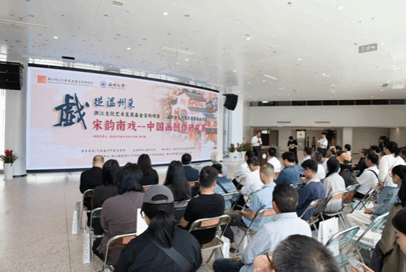 谢子静教授作项目介绍,温州素有“南戏故里”之称,自宋至今,戏曲在温州、浙江乃至全国各地得到了传承和发展。自当代以来,南戏文化在不断演变,包括戏曲文化与民俗文化,它们与中国画艺术相融合并以各种形式不断传承蜕变。她介绍,本次展览将以南戏名剧为核心,同时结合温州各地的古戏台建筑及戏曲壁画,以期对戏曲历史的挖掘追寻对时代精神的描摹和探寻南戏之源。通过美术作品创作的形式展现宋韵文化的传承,宣扬温州独特的文化和时代风貌,致力于对“宋韵精神”在当代历史进程中的继承发扬展开考察与探索。她继而说道:“在接下来的创作中,项目将以人物画、花鸟画、山水画不同题材形式展现宋韵文化,并包括以下五个创作主题:一是关注南戏文化的‘戏曲故里’;二是关注经典剧目的‘南戏探源’;三是关注古戏台等遗迹的‘宋韵遗迹’;四是关注服装、化妆、道具等纹样的‘几度飞花’;五是关注温州戏曲美术创作的现代转换‘时代风貌’。”