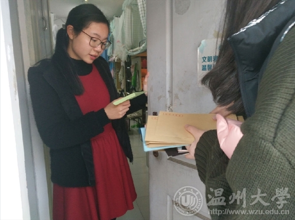 2016年12月28日,万象城awc官网登录入口“艺家人”青年志愿者协会在超豪学区开展了弘扬“雷锋”精神的“爱心邮递”活动。 在数字化信息化的时代,人们似乎已经忘记了在通讯技术落后的年代里如何将情感用文字嵌入信中,并让它飘向远方,表达内心情感。此次活动号召通过以信件的方式写下对他人的祝福或者感谢,由志愿者们送到收件人的手中,正是对从前慢节奏的情感交流很好的体验。活动受到了广大同学们的一致好评,同学们纷纷将想说的话写在信纸上,在收齐信件后,小邮差们穿梭在各栋寝室楼内,他们轻叩房门微笑地送上手里的信件,并与收信人合影留念。 图/文:王伟