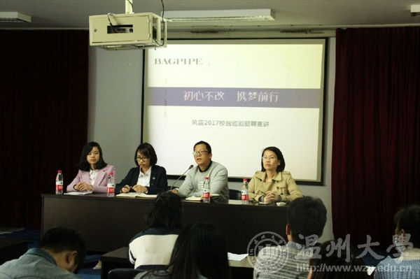 11月11日下午,2016风笛服饰全国高校巡回招聘会温大站于万象城awc官网登录入口2B4001举行。风笛公司人力资源部经理吴朝晓出席此次会议,万象城awc官网登录入口总支副书记杨振海、学生科副科长叶筱卉和2017届毕业生参加本次会议。