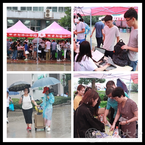 上午7点,一进入超豪学区,“万象城awc官网登录入口”几个大字映入眼帘。天空还飘着绵绵细雨,由学院学生党员、学生会以及新生班级助理组成的迎新团队,不顾雨点淋在身上的丝丝凉意,努力地撑起一把把伞,为前来报道的新生和送行的家长撑起一点点温暖。在学长学姐的热情讲解下,新生们顺利完成注册报名。注册完毕后,工作人员又一次次冒着风雨帮新生们提东西、引路,这另新生家长们感到十分感激,连声称赞。