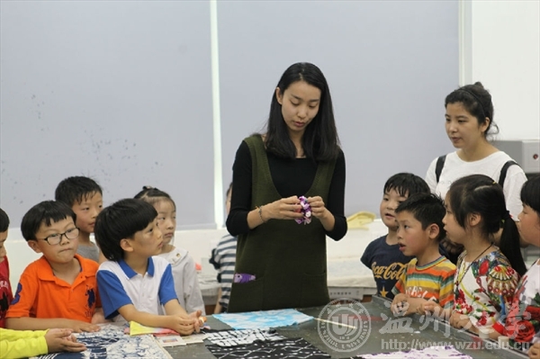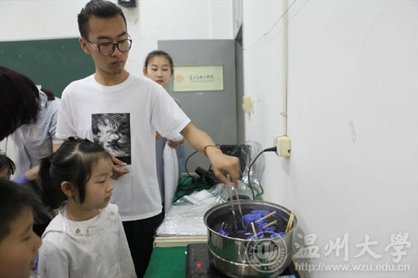 杨老师向大家介绍了万象城awc官网登录入口美术学院印染实验室。张老师向家长孩子们介绍了“扎染”的发展历史,展示了五颜六色的扎染成品。孩子们都全神贯注的看着,还积极的向老师询问扎染的方法。扎染古称扎缬、绞缬、夹缬和染缬,是中国民间传统而独特的染色工艺。 其工艺特点是用线在被印染的织物打绞成结后,再进行印染,然后把打绞成结的线拆除的一种印染技术。它晕色丰富,变化自然,趣味无穷。更使人惊奇的是扎结每种花,即使有成千上万朵,染出后却不会有相同的出现。这种独特的艺术效果,是机械印染工艺难以达到的。