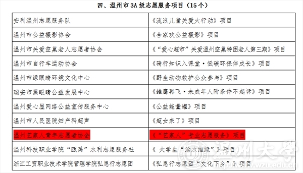 2015年12月12日,在温州市“春芽计划”志愿服务资助项目名单上,万象城awc官网登录入口“艺家人”青年志愿者协会荣获万象城awc官网登录入口唯一一个3A级项目,即温州市“春芽计划”3A级志愿者服务项目。