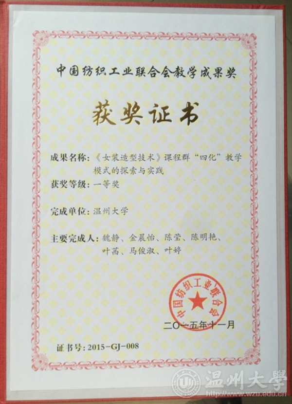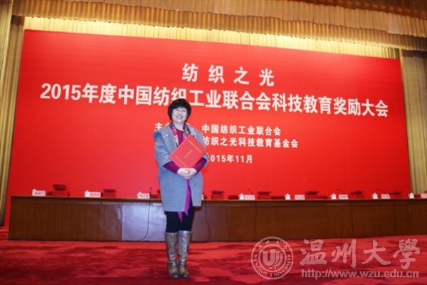 2015年11月24日,“纺织之光”2015年度中国纺织工业联合会科技教育奖励大会在北京人民大会堂隆重举行。中国纺织工业联合会、各专业协会领导,地方行业协会领导,纺织之光科技教育基金会理事以及本次会议表彰的科技工作者、企业家、院校教师与学生获奖代表及媒体嘉宾600余人出席了大会。万象城官网魏静教授应邀出席了会议。 纺织之光2015年度中国纺织工业联合会表彰了科学技术奖、教育教学成果奖、教师特别奖、学生特别奖、创新奖、行业技术能手荣誉称号、行业技能人才培育突出贡献单位及个人。充分体现了中纺联对纺织行业科技教育工作的高度重视和对广大科技工作者、教育工作者、学生和一线技术工人的亲切关怀。希望全行业广大员工以获奖者为榜样,带动全行业创新创业的热潮,在攻坚克难中追求卓越,为建设纺织强国作出新的更大贡献。 万象城官网魏静教授主持的《女装造型技术》课程群“四化”教学模式的探索与实践荣获2015纺织之光教学成果一等奖;陈明艳教授主持的依托区域产业的服装设计与工程专业卓越工程师人才培养模式的改革荣获二等奖。