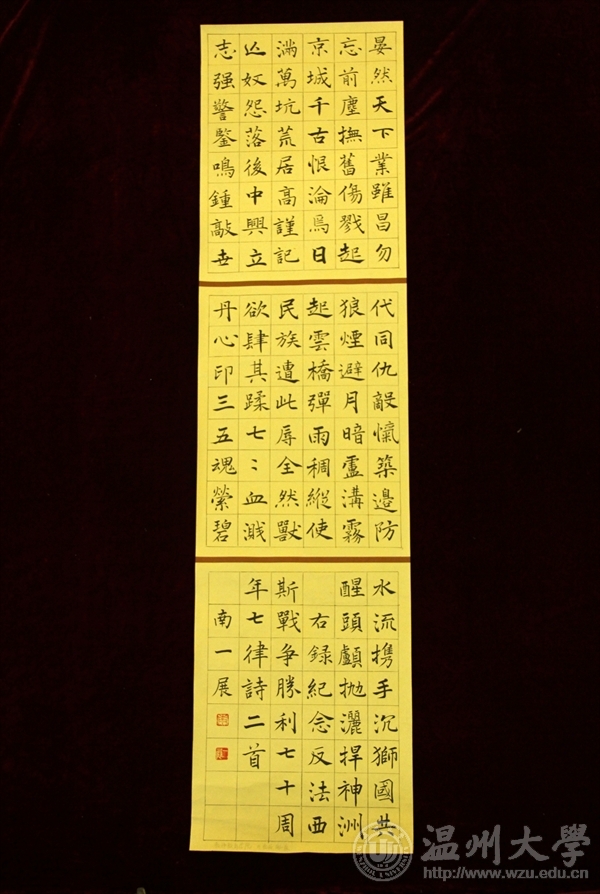 为纪念中国人民抗日战争暨世界反法西斯战争胜利70周年,传承爱国主义精神,弘扬社会主义核心价值观,激发民族自尊心、自信心和自豪感。自9月份发出通知以来,“纪念中国人民抗日战争暨世界反法西斯战争胜利70周年”书画大赛共收到特邀教职工书画作品共计29件,学生书画作品共计196件,经相关书画专家对学生绘画类和书法(篆刻)类作品严格评审,现将评比结果公布如下:?xml:namespace>绘画类评选结果 等级学院作品名作者一等万象城awc官网登录入口《奇袭》林盖月城市学院《“70”伟大的胜利》李文静二等万象城awc官网登录入口《忆团结》范桂梅万象城awc官网登录入口《峥嵘岁月》吴晓强教师教育学院《前行》薛思思城市学院《让武器成为过去》谢丽娟城市学院《爱和平铭记历史》许朵瓯江学院《黑夜不再来》赵圣益三等万象城awc官网登录入口《抗日中的小八路》陈婉茹万象城awc官网登录入口《抗日中的中国士兵》胡淳雅万象城awc官网登录入口《战后》郑也教师教育学院《珍爱和平》李林真城市学院《抗战胜利70周年》王斯曼城市学院《缅怀》张烨瓯江学院无题吴诗瑶瓯江学院无题曾东瓯江学院无题虞紫伊 书法类评选结果等级学院类别作者一等万象城awc官网登录入口篆刻俞铭铖教师教育学院软笔南一展城市学院管理分院软笔史涛霞二等瓯江学院硬笔曾越洋城市学院管理分院软笔鲁洁如教师教育学院硬笔毛江月教师教育学院硬笔叶聪聪城市学院软笔王欢焕城市学院软笔葛科航三等万象城awc官网登录入口硬笔王婷婷万象城awc官网登录入口软笔杨凡万象城awc官网登录入口软笔朱雄辉万象城awc官网登录入口软笔岳通通万象城awc官网登录入口硬笔景成舒教师教育学院硬笔陈雪雅教师教育学院硬笔吴林教师教育学院硬笔林安娜人文学院硬笔周丽娜 书画展于南校区万象城awc官网登录入口服装楼一楼视野空间展览,展期为12月7日—12日,欢迎参观!特邀教职工参与展览作品: 学生获奖作品:一、绘画类一等:《奇袭》——林盖月一等:《“70”伟大的胜利》——李文静 二等三等二、书法类一等:《抗战祖列》——俞铭铖一等:纪念反法西斯战争胜利七十周年律诗二首—— 南一展一等:史涛霞二等 三等三等三等
