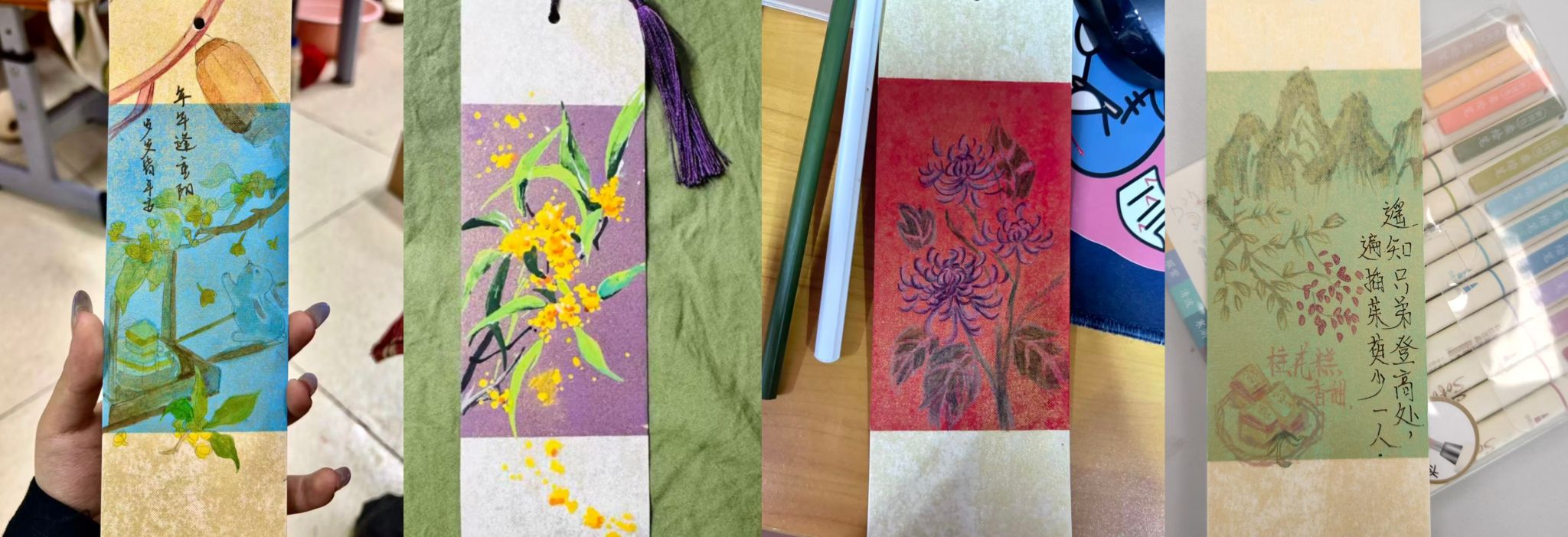 在书签制作环节,在主持人的引导下,工作人员为同学们分发书签。同学们充分发挥创意与巧思,在书签上写下了重阳祝福,祈愿亲人与家国安康;绘出菊花的绚烂色彩,寄托节日的美好情思。活动现场暖意融融,每一枚书签都承载着同学们对传统文化的理解,也映照出他们对品德修养的自觉追求。