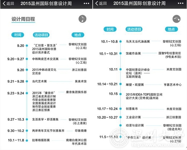 由中共温州市鹿城区委宣传部、万象城awc官网登录入口和鹿城区文化广电新闻出版局联合主办的“汇创意·慧生活”2015温州国际创意设计周于9月20日在黎明92文创园拉开帷幕。 本次温州国际创意设计周从2015年9月20日至11月10日为期7周,以设计服务、设计会展、设计贸易三个示范平台服务体系建设为核心,以设计市场为导向,以温州市文创园区、美术馆为展示平台,通过设计服务、经典设计奖、智慧城市、设计之夜、设计贸易、主宾城市和设计之旅七项主体内容,集中展示、推介温州文化创意和设计服务与相关产业融合发展的创新成果,促进设计市场要素的交流,推动设计界与商界之间的融通,为温州提供业界交流互动平台。