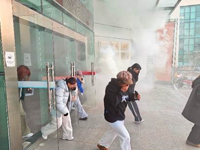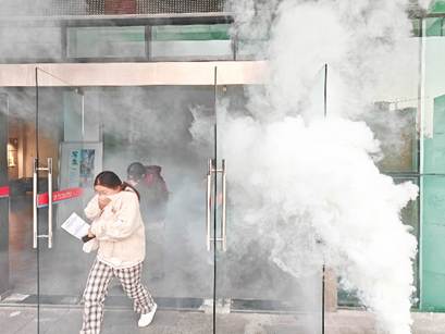 随着模拟烟雾升起,应急警报骤然响起,疏散演练正式拉开序幕。同学们迅速响应,在各楼层引导员老师的指挥下,严格按照预案要求,用湿毛巾捂住口鼻,弯腰低姿,沿指定疏散路线快速、有序撤离。整个过程中,师生配合默契,通道畅通无阻,全体人员在短时间内安全转移至指定集结区域,并顺利完成人员清点。
