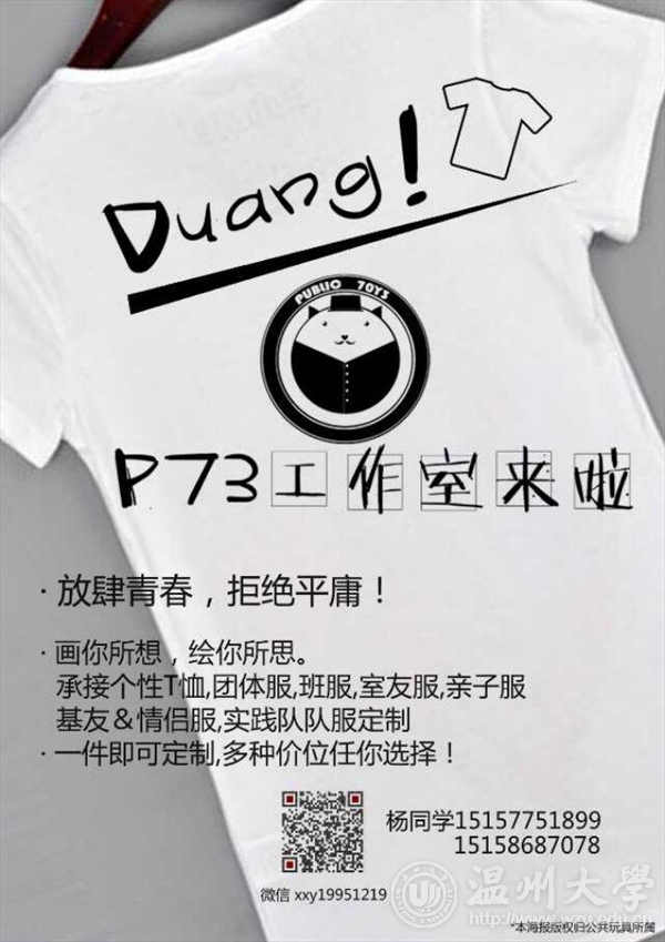 “创客”一词来源于英文单词"Maker”,是指出于兴趣与爱好,努力把各种创意转变为现实的人。他们热衷于创意、设计、制造,最有意愿、活力、热情和能力在创新2.0时代为自己、为全体人类去创建一种更美好的生活。 创客中有一个特殊的群体,那就是“艺·创客”,他们是一群充分发挥自己的艺术细胞和设计灵感,运用自己的扎实的专业知识,努力把各种创意变为现实,带进生活的人。我们大美院中就有这样一批人的存在!一、 团队名称P73服装设计 二、 工作室简介 P73服装品牌,建立于2014年4月,核心团队5人,设计人员辐射温大服装系。品牌针对16-28岁人群,现以原创图案和百搭基本款为主,来表现一种既想表达自己个性又想衣服百搭方便,穿出自己风格的人群。现团队以原创设计T恤和卫衣为主,并且承接各类团体服,实践队服的设计制作。 销售方式以网店运营为主,推广方式以微博,微信公共平台为主。目标将来成为设计销售为一体,工厂代加工,线上线下结合的大众百搭品牌。三、 团队组成 杨兴 (13服设2班) 董敏婕 (13服设2班) 李东婷 (13环艺) 张焕强 (13服设2班) 梁杰 (13商务英语 城院)四、 作品展示 五、 创业领域 图案T恤设计销售 个人图案T恤定制 班服,团体服,实践队服 原创帆布袋子 同学们可以为自己设计衣服图案,或把自己课堂上的设计变为实物,自己穿。P73也可以为同学们代卖,并以P73·某某某的方式署名,将自己的设计投放市场。 六、 创业感言 我们大学生在进行创业时,建议结合所学专业,利用专业知识选择创业方向,并应该注意以下几点: ● 创业要以适度创新为原则,结合市场动态; ● 充分利用和结合自身或团队成员的专业知识; ● 注意保证团队的感情融洽,工作分工明确。 地址:万象城awc官网登录入口创业园A12号负责人:杨兴(15157751899/641899)供稿:P73服装设计工作室本版编辑:张昇终审:李艳燕