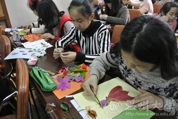 志愿者们图文并茂的讲解让小朋友惊叹不已,并很快投入课堂。他们小心翼翼地将收集好的树叶和花瓣处理成不同的形状,粘贴到彩色卡纸上。片刻,瞪着大眼睛的金鱼,骄傲的孔雀,美丽的公主,热闹的海洋世界,垂钓的老人等各种生动形象跃于纸上。课程落下了帷幕,小朋友们骄傲地挺直小身板将自己满意的作品上交到讲台上。