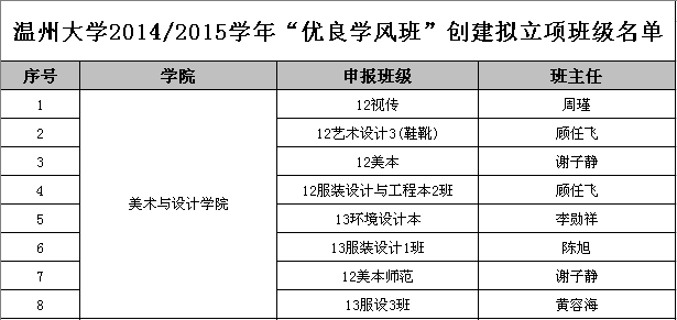 在万象城awc官网登录入口2014-2015学年“优良学风班”创建立项申报中,万象城官网各班级积极参与,踊跃申报。最终有8个班级立项成功,使美术学院成为本学年万象城awc官网登录入口“优良学风班”创建立项班级数最多的学院。希望成功立项的班级班委对照创建方案和目标,广泛动员每一位学生积极参与到优良学风班的创建中来,确保立项目标的实现,争取在下学年取得“优良学风班”荣誉称号。班级名单如下: