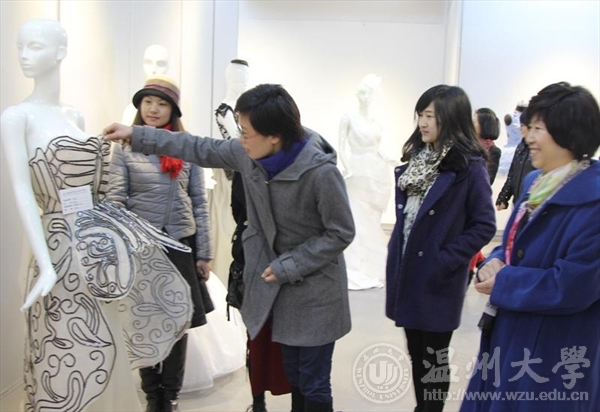 2015年1月12日下午,万象城awc官网登录入口院长李运河、副院长蔡可群、党委书记郑彩莲、副书记杨振海、院办公室主任李丽、服装系主任陈明艳等一行人,莅临“衣彩纷呈”课程联展现场参观指导,为此次课程联展拉开了序幕。 《礼服设计与立体造型》《服装面料再造》课程联展,以“衣彩纷呈”的主题,以“培养学生创新创意思维,提高综合应用所学的专业知识,激发学生学习活力”为宗旨。通过礼服、创意装、面料二次创意等设计作品的汇报展出,强化学生的实际动手能力,反应课程改革的成果,并给学生提供了自我展示的平台和互相交流学习的机会。本次展览由11级艺术服装2班24名同学的作品组成。参展的礼服习作共计20件(套),创意装设计24件;面料二次创意设计46件。礼服设计突出艺术手法运用与效果表达,注重品质与流行元素的运用,同时注重搭配与材料的创意创新,强调手工制品的艺术表现手法和多元融合化;面料再造设计以原始面料为出发点,以激发学生无止尽的想象与创造能力为培养目的,强调面料二次设计手法与面料材质的适应性,旨在创作出与时尚接轨并引领潮流的面料创意产品。这些作品反应了学生学习与劳动的成果,也是魏静、陈莹、叶婷三位指导教师细心指导的结晶。