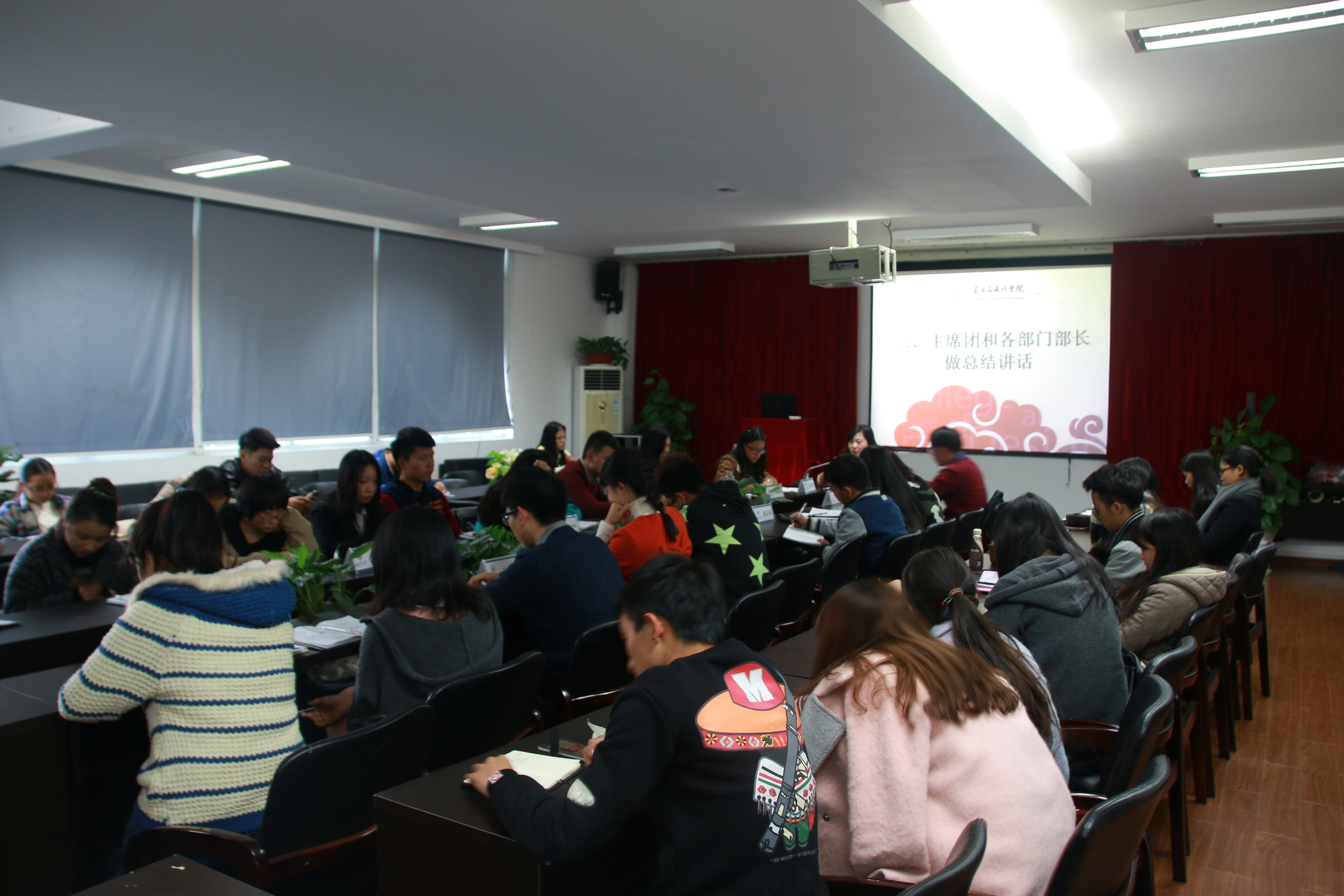 12月6日下午,万象城官网团学第三次全体团学成员大会在美院2B4001如期举行。与会人员有学院学生科辅导员杜茜、团委副书记金李斌、学生会主席吴荣婷、学生会副主席叶佳颖、冯瑜瑜以及各部门部长与干事。