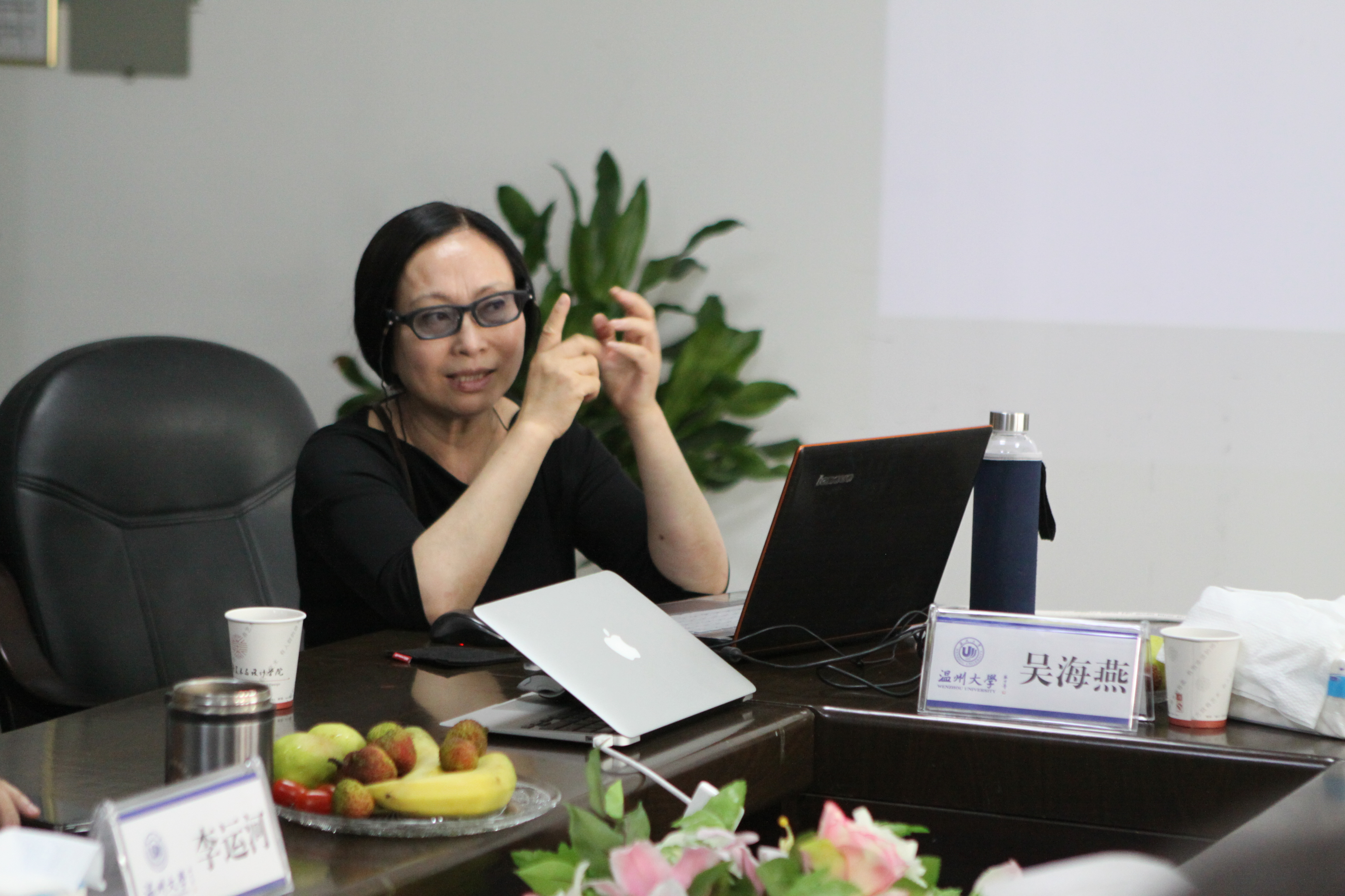 讲座中,吴海燕教授通过设计历史的三个阶段:农耕时代、工业时代、网络时代。结合设计与自然的关系,讲述设计的综合进化、设计教育和设计原则,从而引出设计入道的主题。吴教授以温州的经济文化红花染等为例指出设计应该明白自然规律,注重设计与自然的关系。她指出,本着“人与自然是设计本源、人与物是设计本质、人与人是设计本位、人与社会是设计本义”的设计原则,通过反思早期的艺术教育并结合社会发展开展特色设计教育,进行艺术设计的综合进化。最后,吴海燕教授综合提出了设计入道的观点,设计要入景、入境、入情、入术和入理,是相互关联层层递进,生生不息的艺术创作过程。随后,就设计教育的问题,吴教授与在场师生进行了愉快的交流和分享。