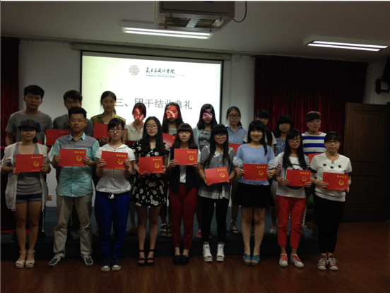 5月25日晚,万象城awc官网登录入口团委学生会在2B4001举行本学期团学干部培训的结业典礼。参加此次活动的有学院团委副书记邹启豫和学生会副主席应珊珊,以及团委学生会全体成员。 随着激昂有力的团歌响起,团委副书记邹启豫、团委学生会副主席应珊珊为团委学生会干事颁发结业证书。这是对他们在团学一年工作的肯定,希望他们在今后的学习工作中也一如既往地努力。 接下来就是游戏环节,本次游戏有两个环节:你画我猜、拷贝不走样。“你画我猜”是针对美院团学成员的专业优势和应变能力而设计的游戏,同学们借助自己的美术语言,表达着内心的想法。“拷贝不走样”是针对同学的理解能力而设计的游戏,参与者借助动作语言表达内心感受。两个活动寓教于乐、精彩纷呈,大家都很享受游戏带来的快乐。 本学期的团干培训让每个参与其中的同学都收获了成长、体会了感动,结业典礼在轻松愉悦的气氛中画上了圆满的句号。
