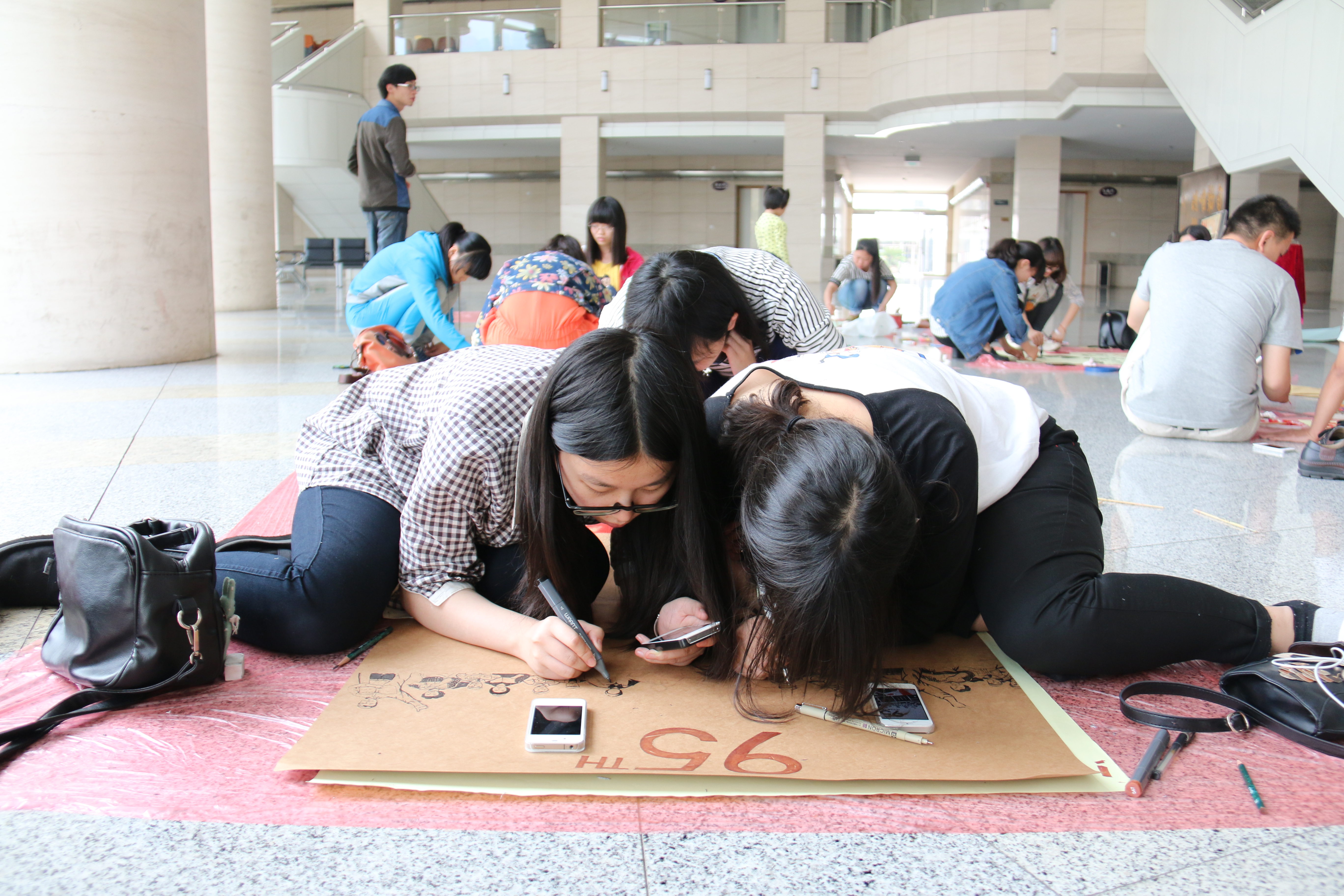 比赛现场气氛轻松欢快,在优雅的音乐声中,参赛选手们灵感涌现,在海报上泼墨挥洒,张扬个性。随着音乐,选手们仿佛抛开了所有的杂念,沉浸在艺术的殿堂中。比赛分为团体组和个人组,团体组激烈地对画面展开讨论,交流彼此的海报构思;个人组则沉浸在自己的构思中,忘我地画着属于自己的小天地。有的海报张显着年轻的激情,有的海报蕴含着唯美的意境,有的海报怀旧复古,还有的海报充满了积极向上的正能量。
