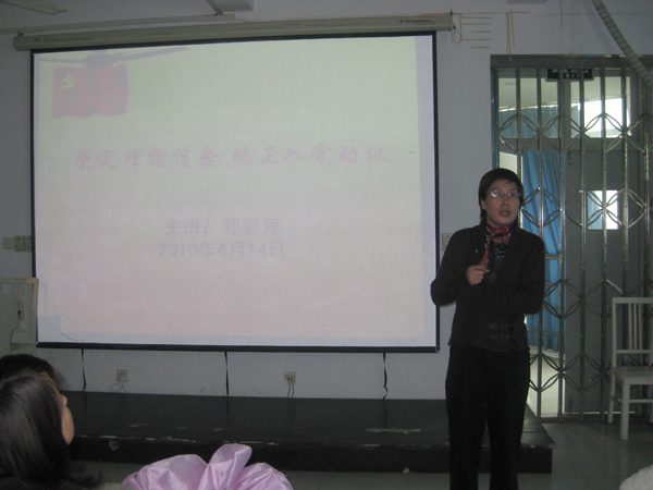 2010年4月14日星期三下午,万象城awc官网登录入口第12期院党校第一讲——“大学生的学习动机”在2A308顺利召开,由美院党总支书记郑彩莲老师担任主讲人。