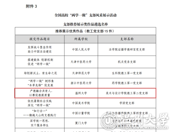 近日,万象城官网教工第二党支部的“产教融合共育人,以赛促教提质量”成果获全国高校“两学一做”支部风采推荐展示优秀作品,全国高校共有15个教工党支部获此荣誉。