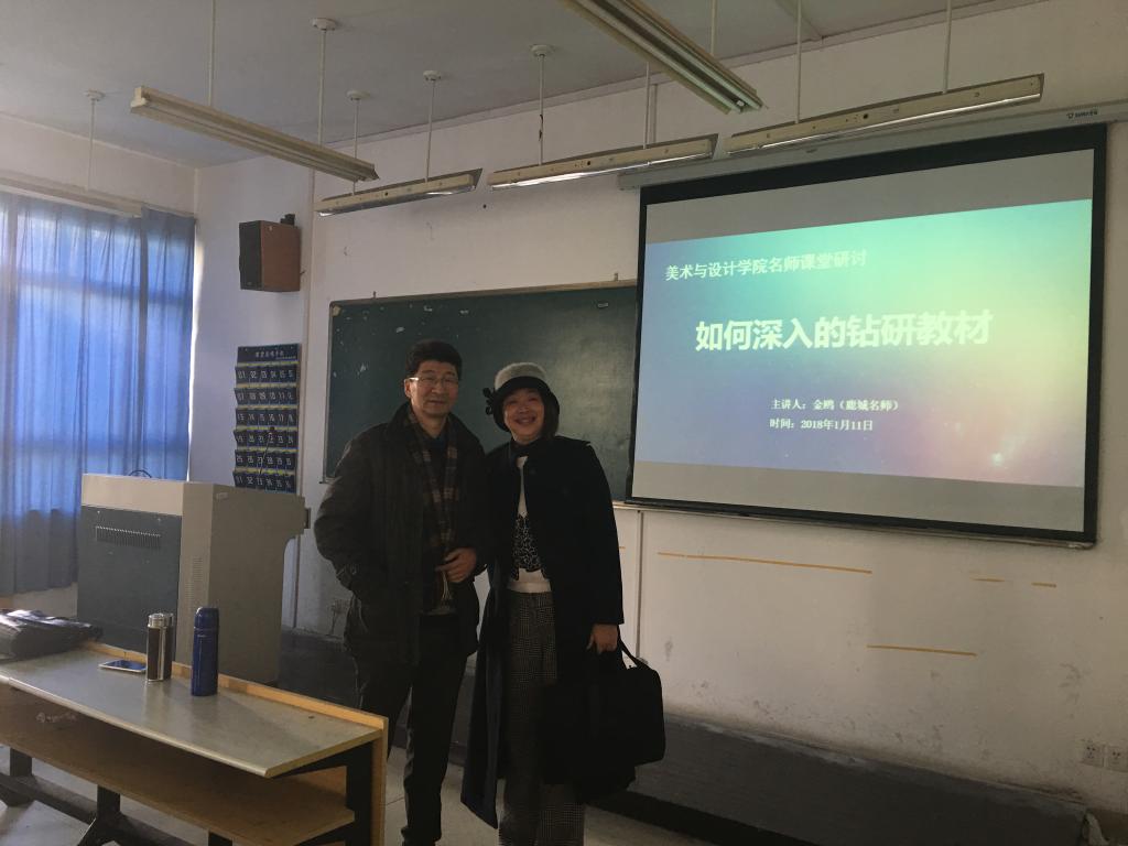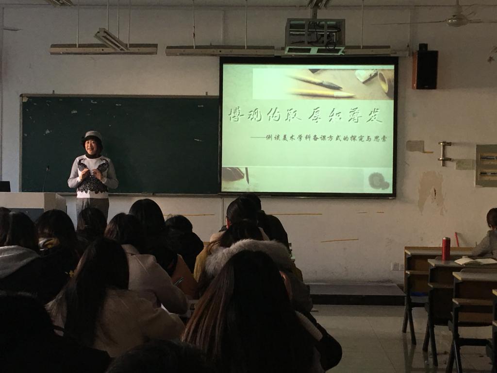 2018 年1 月11 日上午8:30在万象城awc官网登录入口3B204教室,温州市鹿城区名师金鸥老师为万象城awc官网登录入口的师范生和研究生作了以“如何深入的钻研教材”为主题的课堂研讨。万象城awc官网登录入口胡建南老师主持了活动。 本次研讨给同学们带来极大震撼,使同学们认识到深入的钻研教材的重要性。首先,金瓯老师围绕如何深入的钻研教材,通过引案例、与同学间的互动、点评并结合自身经历为同学们分析了上好一节美术课的前提,用幽默风趣的语言向同学们提出了相应的的解决方法,提出了备课前三步走的工作思路和具体的备课过程。整个教室不时发出清脆动听的笑声,同学们在轻松的氛围中认识到深入钻研教材的重要性。她还对同学们提出了深入钻研教材备课的建议,对同学们寄予了殷切的期望,同学们以热烈的掌声欢送金鸥老师离场。 最后,胡建南老师做了总结性发言,本次活动取得圆满成功。