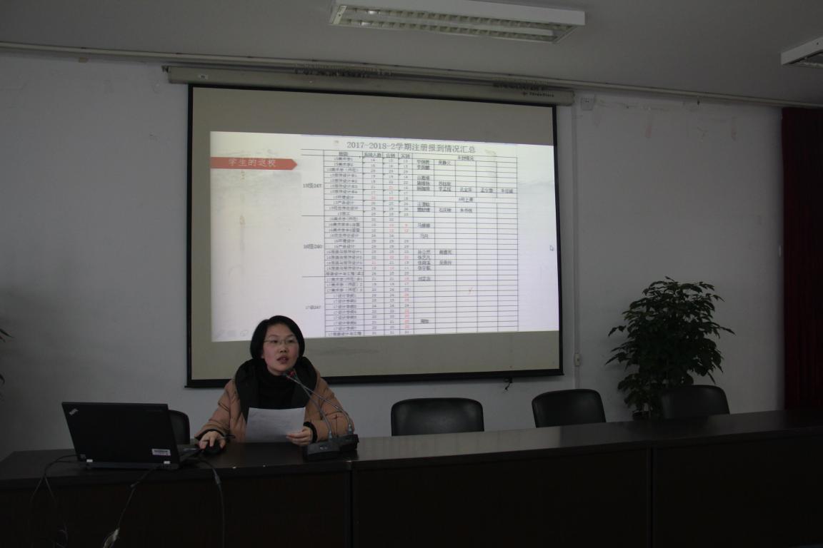 学生科叶筱卉老师公布了2017-2018学年第一学习学院优秀班干部、工作积极分子名单和开学初学生返校情况,并对开学初班主任工作进行了布置:各班班主任要在第二周内召开本学期的第一次主题班会并按时上交《主题班会记录表》;班主任要深入了解并掌握学生春节期间、开学初学生的思想、学习、生活等各方面情况,积极配合学校开展开学初学生思想动态网上调查,及时发现学生存在的思想和认识问题,反馈学生反映强烈的意见和建议;新学期要营造浓郁的学习氛围,进一步加强学风建设,落实“课堂拒绝手机”制度,鼓励班级同学参加“五班十星”评比。毕业班班主任要重点关注毕业生返校和入住情况, 准确掌握未及时返校的毕业生的去向和动态,并做好在外实习安全教育工作,在外实习毕业生务必填写《万象城awc官网登录入口毕业班学生报到注册联系单》。关于学工系统的数据维护,班主任要及时将与学生的谈话情况录入学工系统,并提醒学生在学工系统中及时更新个人联系方式等信息。