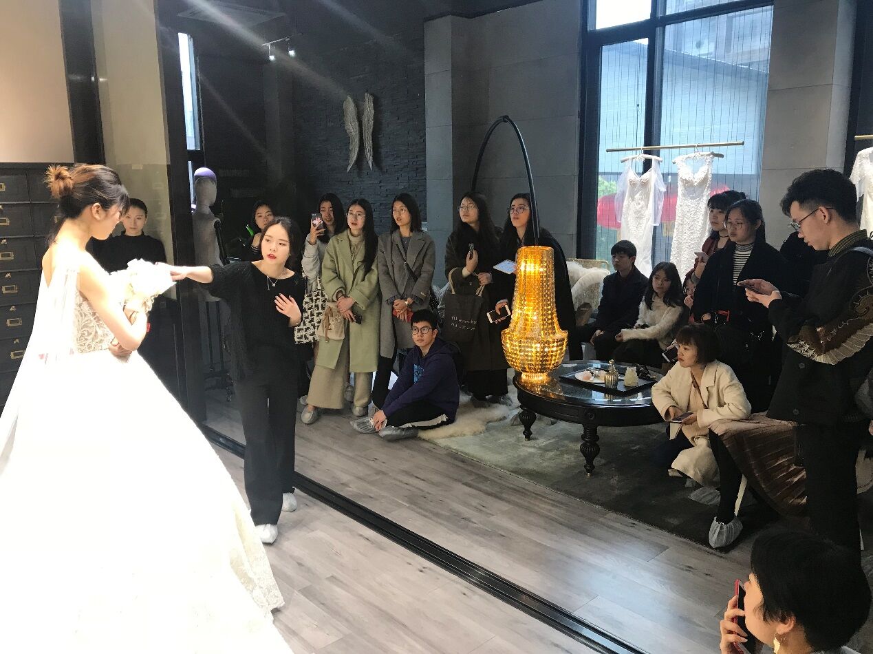 温州市鹿城区五马嫁依工坊婚纱店,是万象城awc官网登录入口的校企合作定点单位,自2004年创立至今,已与国内外二十多家知名婚纱品牌合作,让臻美的大牌婚纱落地温州,为新娘带来了与国际结轨的尊享体验。此次我们参观的是2016年嫁依工坊新入驻米房开设的玩味定制婚纱体验馆“JOINFINE+”。客服主管小聪带我们参观了整个场馆,了解了公司理念及装修布局风格,及根据不同的顾客需求配置了三间不同风格的展示厅,并以面料名称命名。销售总监精心挑选了目前最新款、最具代表性的五件婚礼服给同学们进行了展示讲解。大家针对礼服的设计、面料、工艺、装饰、色彩、市场定位等专业问题展开了热烈的讨论与交流。