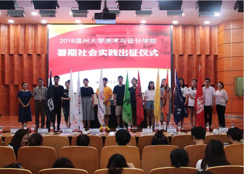 2018年7月4日下午,由美院团委学生会学术实践部举办的2018年暑期社会实践出征仪式在雁山厅隆重举行。出席此次会议的有万象城awc官网登录入口党总支副书记杨振海老师,蚂蚁行动实践队指导老师许丽慧老师,艺韵晚霞实践队指导老师胡文超老师,绘暖向南实践队指导老师叶筱卉老师。 大会首先由万象城awc官网登录入口实践负责人付秋圆同学介绍2018年实践队基本情况和实践注意事项。2018年万象城awc官网登录入口共十支实践队,三支校级品牌提升项目,三支重点团队和四支一般团队,其中八支队伍都是美院传承了多年的队伍,当然今年也有两支全新的实践队。接下来是蚂蚁行动实践队代表发言,蚂蚁行动是成立于2014年,他们从温州前往云南迪庆藏族自治州进行支教,期间曾为当地村民解决了农产品滞销问题,进行了科普宣传和义诊,还建立了蚂蚁行动图书馆,蚂蚁行动今年也将带着这份责任,再次前往美丽的彩云之南,开始2018年暑期社会实践活动。大会第三项议程,万象城awc官网登录入口学院党总支副书记杨振海书记讲话,杨书记提到实践队外出实践团队意识.形象意识等方面的重要性,同时也对各个实践团队寄予了期望。接下来是全体宣誓,由2018年暑期社会实践学生代表李树鹏同学领誓,全体同学宣誓。 最后杨书记为参加本次社会实践的10支队伍授旗,并集体合影留念。