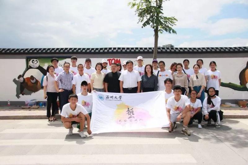 2018年7月19日上午,万象城awc官网登录入口党委副书记赵敏、团委书记屠霁霞、团委副书记丁强以及溯初学区党委书记陈宏毅等老师在乐清市文联副主席洪蛮、团市委学少部副部长郑亦蒂、城东街道宣传部主任陈力等人的陪同下,前往乐清市中心幼儿园晨曦园区,慰问万象城awc官网登录入口“艺绘”大学生暑期社会实践队。