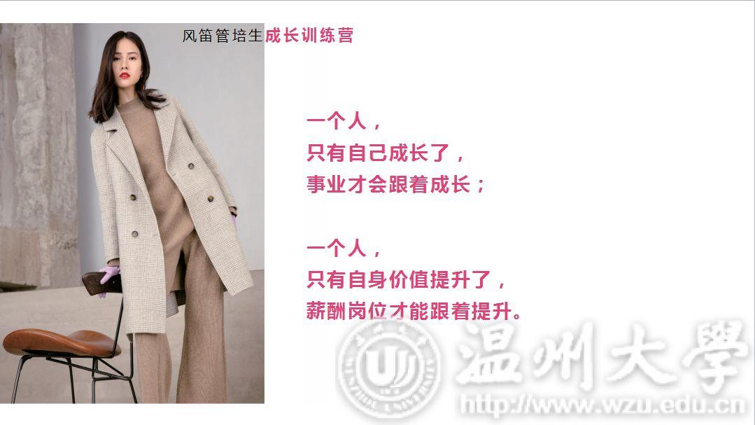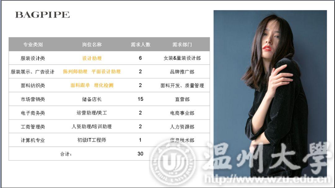 10日19日上午,Bagpipe风笛2019无限想象全国高校巡回宣讲会在美院顺利展开。在多年的合作与交流当中,风笛与温大也结下了不解的情缘。本次宣讲会有学院党总支副书记杨振海与风笛服饰有限公司经理吴朝晓莅临宣讲会现场。 首先是杨书记致开场词,在同学们热烈的掌声中,杨书记侃侃而谈。“温州风笛服饰有限公司与温大美院搭建了一个非常典型的校企合作平台,风笛公司作为我校省级校外实践教育中心,与万象城官网在专业教学、实习实训、就业创业等领域开展全面战略合作,我们非常高兴看到风笛公司一直以来欣欣向荣的发展态势,也希望双方能携手结出更多合作成果。” “不忘初心,使命必达。”风笛宣讲人缪老师在分享风笛创始人创业史、发展史,讲述风笛的过去、现在与未来,同学们都听的津津有味。宣讲会在主持人和同学们的互动中开始后,主持人分别从公司品牌设计风格,员工的衣食住行娱,薪资问题和管培生培养计划等几个同学们关心的方面来介绍风笛服饰有限公司的细节。BAGPIPE风笛成立于1999年,是一家自主开发、生产、销售时尚女装和童装的品牌经营企业。风笛公司的女装品牌分为周末时尚,摩登帅气,精致优雅三个风格,而风笛公司的童装品牌的定位则是针对2-8周岁的儿童设计的,风格多样是风笛公司的优势所在。衣食住行方面,风笛公司也非常重视员工的感受,为他们提供了舒适的环境以便于员工们更好的工作和生活。同时,风笛公司也十分重视对人才的培养,也有一套完整的体系进行人才的引入。这便是风笛管培生培养计划的由来。对于进入风笛上班的应届生,风笛建立了完善的“管培生培养计划”,全面打造“一专多能”的复合型人才,让每个进入风笛的应届生迅速成长,成为独当一面的技术或管理人才。在经过由系统培训、店铺见习、核心轮岗和专岗实践四个环节的管培生培养计划之后,实习生便能更好地融入公司这个大集体。说到薪资方面的话题,风笛公司的PPT上有着这样一段话:“一个人,只有自己成长了,事业才会跟着成长。一个人,只有自身价值提升了,薪资岗位才能跟着提升。”从这段话中我们也可以清晰地看到风笛公司对人才和员工能力的重视。对于服装设计、服装展示、广告设计、面料纺织类的专业,风笛公司也提供了如设计助理、陈列师助理、平面设计助理、面料跟单、理化检测的专业让同学们选择,以便给予同学们更大的就业空间。 “风笛未来,无限可期。”这是这场宣讲会的结束语。无限可期的不仅是风笛的未来,也同样是我们美院同学们明媚的未来。正如主持人所说,人生不设限,未来就会精彩无限。我们也相信同学们在一番拼搏之后,会绽放出人生绚丽的芳华。