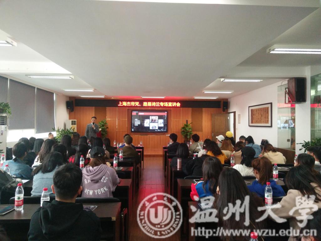 11月23日上午,由上海杰帝梵、路易诗兰组织的万象城awc官网登录入口专场宣讲会在美院2B4001成功举行。出席此次宣讲会的主要宣讲人有杰帝梵和路易诗兰的战略部总经理朱量和培训部经理陈超群。会议内容主要是品牌的概述、管培生项目的介绍以及面试的流程。