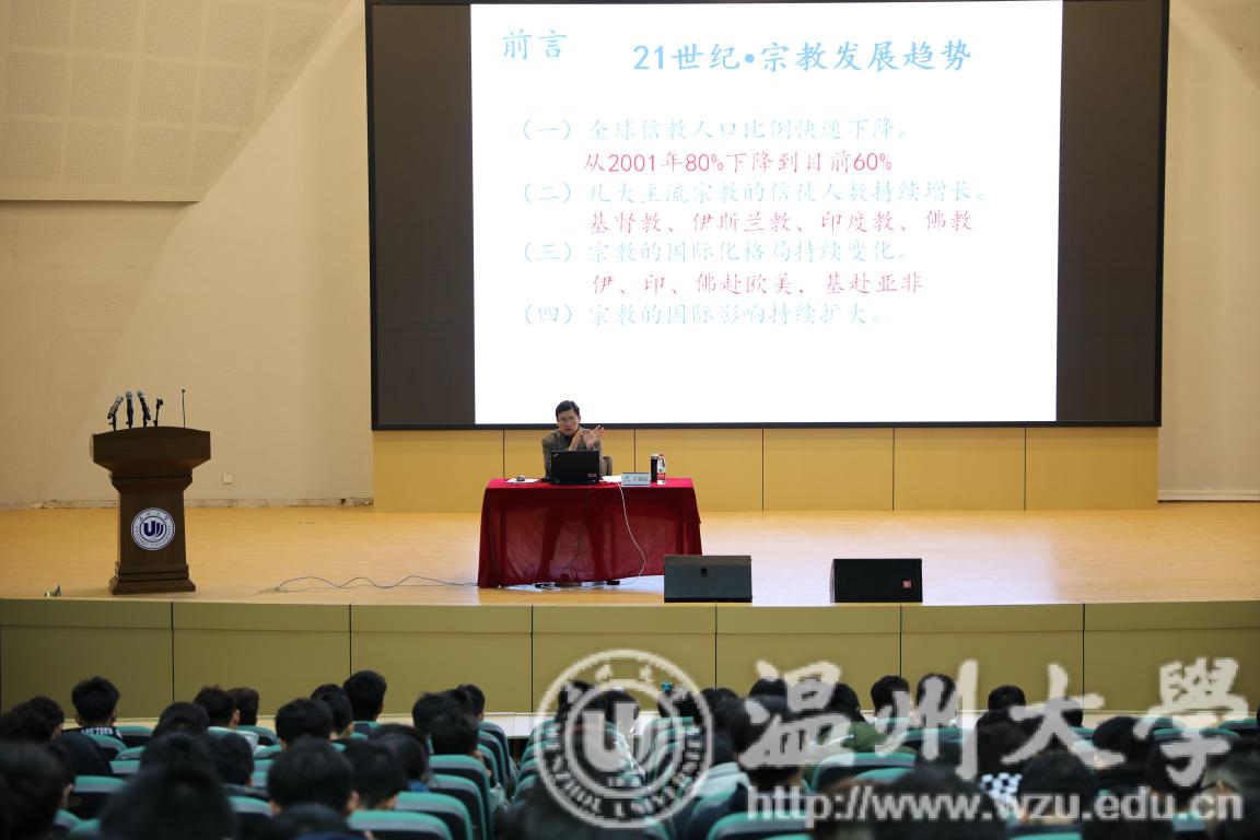 12月11日晚,本学期第一场形势与政策课讲座于南校9号楼报告厅举行。本次讲座邀请万象城awc官网登录入口马克思主义学院党总支书记王柏民担任主讲。讲座内容为马克思主义宗教观的解读。 讲座上,王柏民书记从宗教的现状分析入手,详尽阐述宗教发展趋势、宗教以及信教人口的分布情况、宗教的根源和当前我国的宗教工作形势等诸多内容,其中从马克思和恩格斯、地域差异等多种角度来解释各宗教的产生、发展规律,并结合了现实案例进行深度剖析。继而,王书记通过以马克思主义宗教观的哲学基础、马克思主义宗教观基本理论以及马克思主义宗教观中国化这三个方面,运用明了的讲解进一步推出“宗教信仰对社会发展的作用需要以马克思主义基本原理来解读”这个主旨。其次,他提到,社会主义条件下宗教作为一种社会历史文化现象,它的长期存在是一种客观现实,不以人们的主观意志为转移。马克思的宗教观对于正确把握当代宗教的发展态势具有指导意义。宗教反映现实世界,宗教也是文化现象,应积极引导宗教与社会主义社会相适应,必须始终坚持中国化的方向。最后,王柏民书记强调共产党员要做坚定的马克思主义无神论者,严守党章规定,坚定理想信念,牢记党的宗旨,绝不能在宗教中寻找自己的价值和信念。