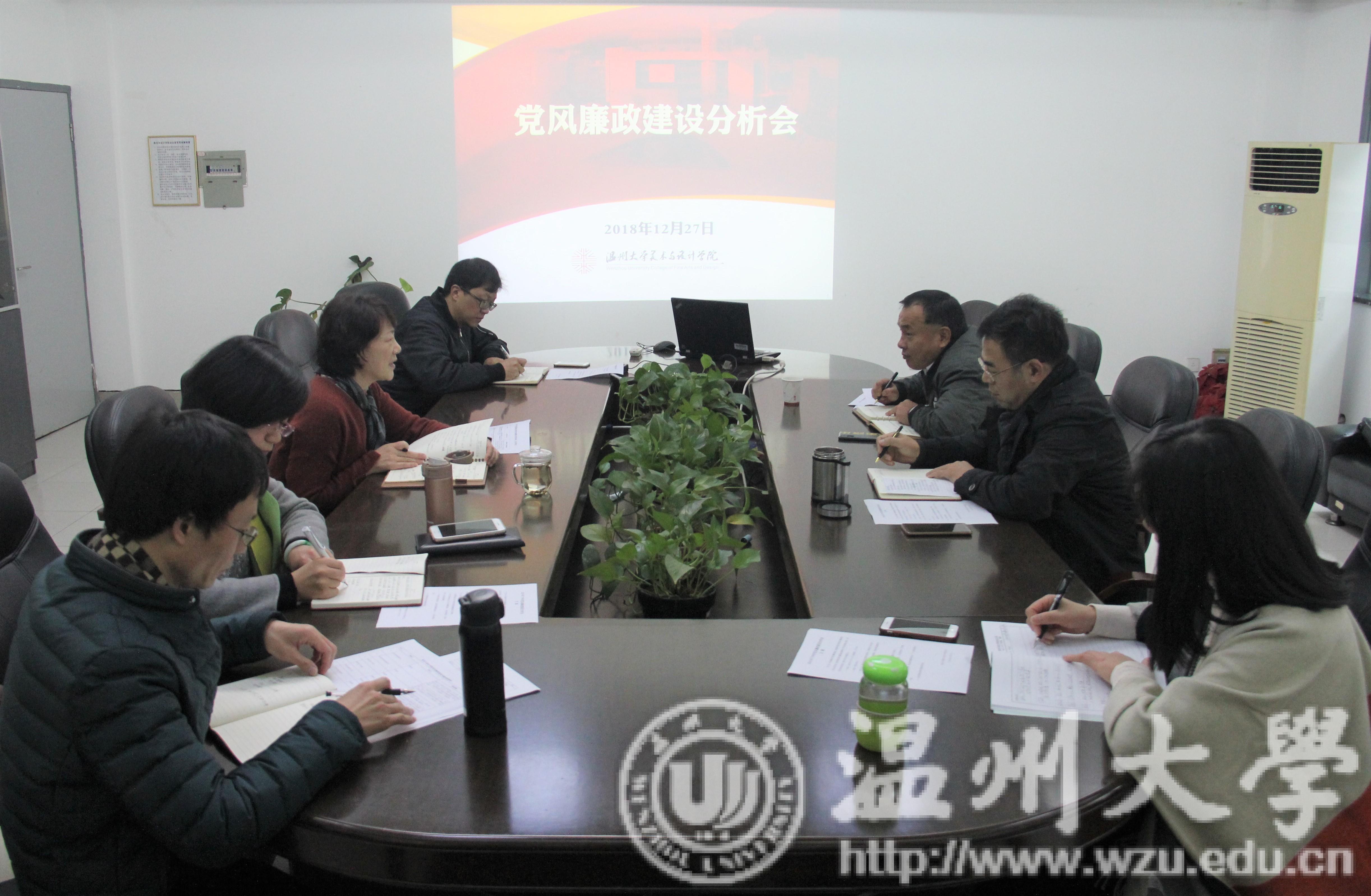 12月27日下午,万象城awc官网登录入口班子在2B216会议室召开党风廉政建设专题分析会。学校工会主席、纪检委员张希均应邀到会指导。会议由学院党总支书记张丽萍主持。 会上,张丽萍书记代表学院领导班子作了2018年下半年党风廉政建设情况分析报告。一是从制度建设上入手加强党风廉政建设,通过一岗双责及任务分解形成长效机制,认真制定并执行相关文件制度;二是及时传达学校相关会议精神,利用每周例会、教工大会向班子内部、全体教师传达会议精神,不断提高思想认识;三是召开专题讲座,除了书记、院长的主题讲座,还邀请赵敏校长、彭小明教授等来院开展专题讲座;四是围绕家风家规家训开展主题教育活动,如永昌堡、霞浦等实地教育实践;五是运用校内经济审计结果开展警示教育,并针对主要问题进行整改落实;六是坚持党务院务公开,在阳光下接受监督,涉及30多个方面的公开内容;七是加强廉政谈话,通过班子一岗双责谈话、廉政预防谈话等,以警示教育为主,提早防范和杜绝腐败。张丽萍还针对目前存在的风险和今后的举措作了详细分析。 院长李运河结合个人工作岗位作党风廉政风险剖析。他从思想认识、工作职责方面分析党风廉政建设工作在认识度和执行力上的重要性。他个人坚守公开透明、阳光是最好的防腐剂;严守秩序、遵守制度;分工负责,集体决策。同时,他对学院工作中可能存在的风险点做了详细排查,比如项目申报、评奖评优、教师年度考核、个人科研项目经费使用、重大项目经费如市长杯、设备购置、招生工作等等重点隐患排查点,在解决方案上要坚守公平公开、严格程序,同时要从制度上立规矩、严把关,人、财、物管理规范化,结合集体决策、警钟长鸣,才能有效杜绝腐败。 班子其他成员分别结合各自分管工作做廉政风险分析、一岗双责落实、民主集中制和作风建设等情况汇报,并结合风险点排查制定了下一步解决方案。 张希均对万象城awc官网登录入口班子党风廉政建设专题分析会给予充分肯定,他认为美术班子非常重视、准备充分、风险点表达准确。同时,他提出针对不同程度的风险,要找准日常风险点,把握原则、不碰底线,处理好责任担当与权力使用的博弈问题。