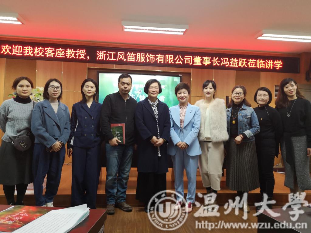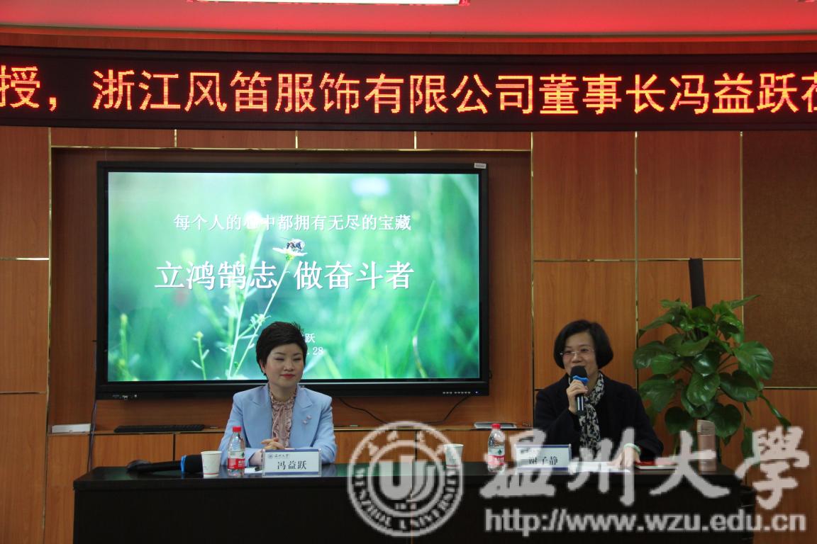 3月28日下午,我校客座教授、浙江风笛服饰有限公司董事长冯益跃女士莅临万象城官网讲学,主题为《立鸿鹄志,做奋斗者》,学院院长李运河教授、副院长谢子静教授、学生科科长叶筱卉、服装与服饰设计教研室主任钟信群以及相关专业教师和学生参与观听,全场座无虚席。学院副院长谢子静教授主持。