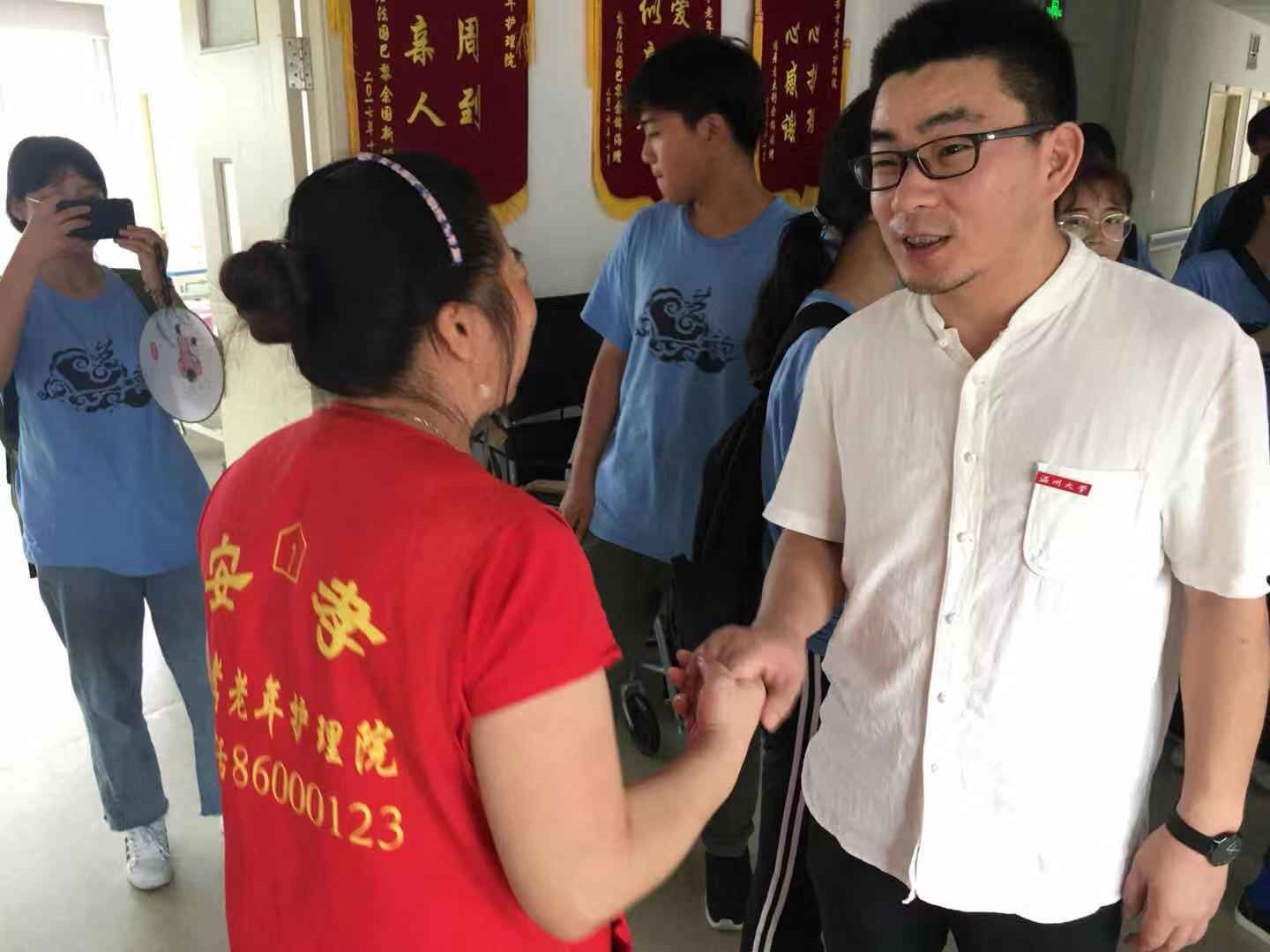 2019年7月18日上午九时许,万象城awc官网登录入口副院长胡文超慰问了正在温州安孝老年护理院关爱老人活动的“艺韵晚霞”暑期社会实践队。初到敬老院,胡院长一行受到实践队员的热情欢迎,通过和队员们简单的交谈后,胡院长进入敬老院里,和敬老院里的护理人员详细了解敬老院的基本情况。