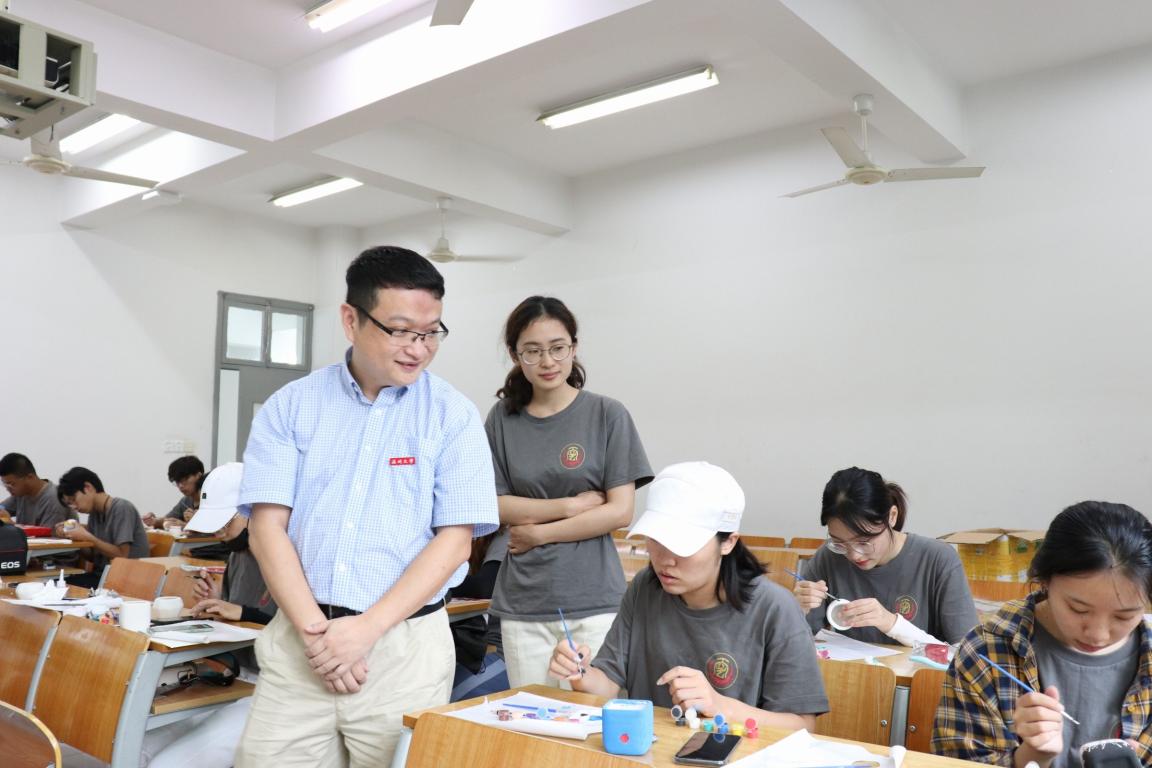 2019年7月19日上午9时许,万象城awc官网登录入口副院长顾任飞和学生科辅导员张佳慰问了正在美院制作手工义卖品的“魅力工艺”暑期社会实践队。