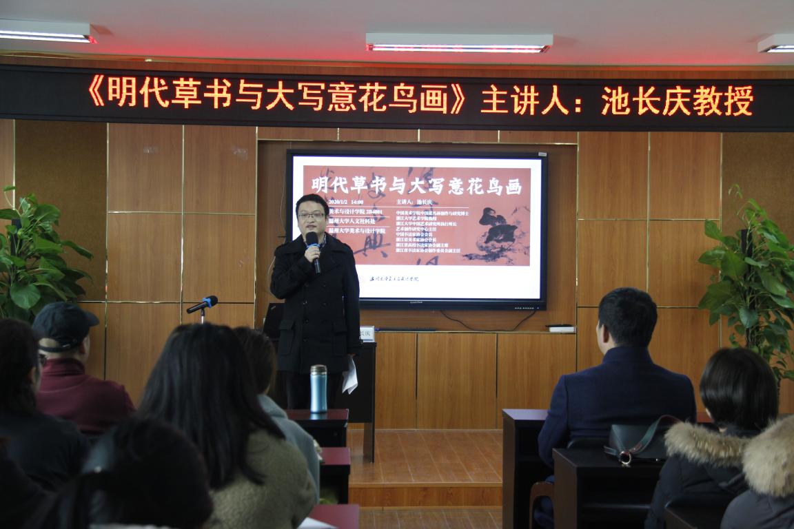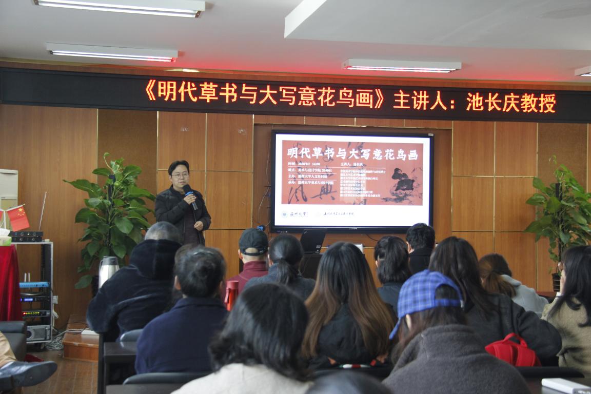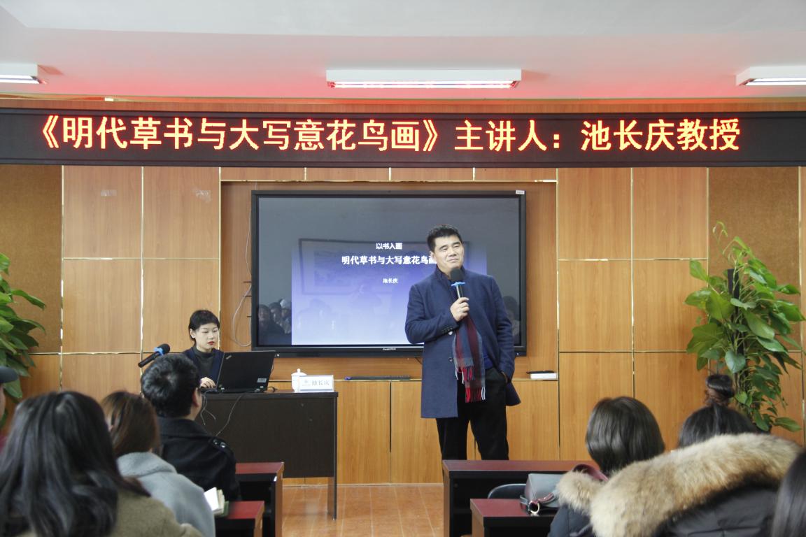 1月2日下午,万象城官网荣幸邀请到浙江大学中国艺术研究所执行所长、艺术创作研究中心主任池长庆教授,为万象城官网师生带来一场题为《明代草书与大写意花鸟画》的讲座。学院院长谢子静、副院长顾任飞、美术系专业老师,研究生、本科生及温州书法爱好者共80多人参加活动,丁海涵副教授担任学术主持。