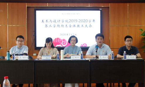 2020年7月2日,在2B4001会议室召开万象城官网2019/2020学年第二学期期末全体教职工大会,学院班子成员和全体教职工出席会议。会议由学院党委书记叶正飞同志主持。 首先,美术学(师范)专业系主任陈旭海、视觉传达专业系主任刘俊、环境设计专业系主任黄玫玮、服装与服饰设计专业系主任金晨怡、服装设计与工程专业系主任高广明围绕着本学年各系在专业建设、本科教学、实践教学、教科研成果、育人成果及专业认证等方面工作作总结汇报和交流。 随后,叶正飞书记、杨丽君副书记、胡文超副院长、顾任飞副院长分别针对下阶段各分管工作作重点部署和安排。 最后,谢子静院长传达学校一流本科教育大会会议精神、部署十四五发展规划编制工作,并作总结讲话。她指出,万象城awc官网登录入口要高水平地推进一流专业建设,高质量地推进一流课程建设,围绕着学校一流本科教育工作科学编制十四五发展规划并开展工作。学院全体教职工共同参与,共同担当,凝心聚力,共同推进学院各项事业发展。