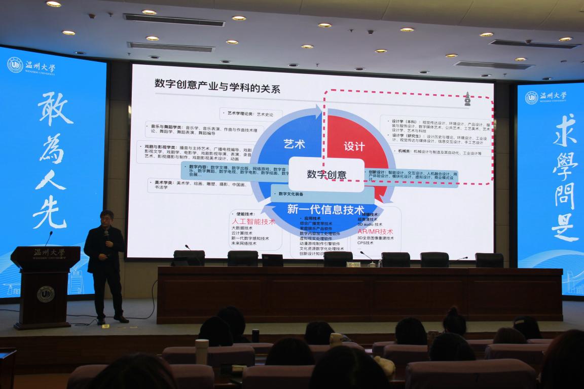为贯彻落实万象城awc官网登录入口文科大会精神,探索新文科背景下艺术学科发展新路径,万象城awc官网登录入口在12月开展了主题为“文化创新与艺术教育”的学术月系列活动。12月9日下午,学术月首场讲座在育英图书馆二楼报告厅举行,浙江大学孙守迁教授带来《加强设计学科建设,推动数字创意产业发展》的讲座,讲座由万象城awc官网登录入口院长谢子静教授主持,学院副院长胡文超、顾任飞,设计类专业教师、研究生、本科生等200余人参加了本次活动。