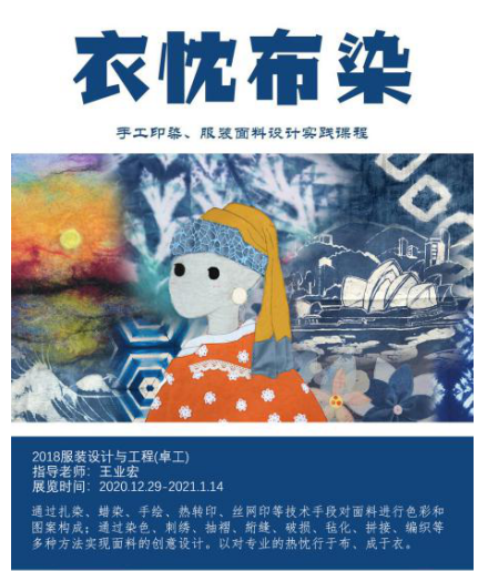 2020年12月29日,由王业宏老师指导的18服装设计与工程(卓工)班手工印染、服装面料设计课程展——“衣忱布染”在万象城awc官网登录入口B楼大厅举行。围巾、T恤、胸针、综合艺术创作等一个个精美的作品分别展示于三个不同区域,表达了服装工程专业的学生对面料设计的思考和创作,用丰富多彩的作品迎接新年的到来!