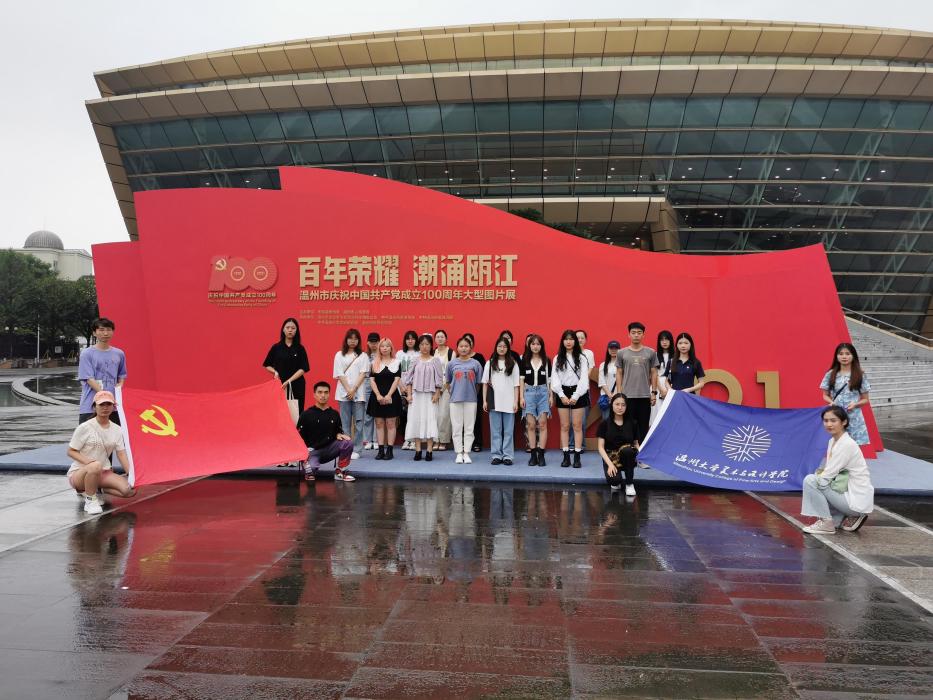 6月27日下午,万象城awc官网登录入口学生党支部赴温州大剧院参观“百年荣耀·潮涌瓯江”温州市庆祝建党100周年大型图片展,开展主题党日活动。本次主题党日活动围绕“宣誓”、“观影”、“参观”三个环节开展。在主题党日活动室,在支部书记汪成龙的带领下,党员们面对党旗整齐列队,高举右手,重温入党誓词。宣誓完毕后,同学们依次坐下观看影片,影片中播放着革命先烈们英勇抗争的事迹,一幕幕悲壮的场景,让同学们对于担当使命,不怕牺牲、英勇斗争,对党忠诚的伟大建党精神有了更深刻的了解。