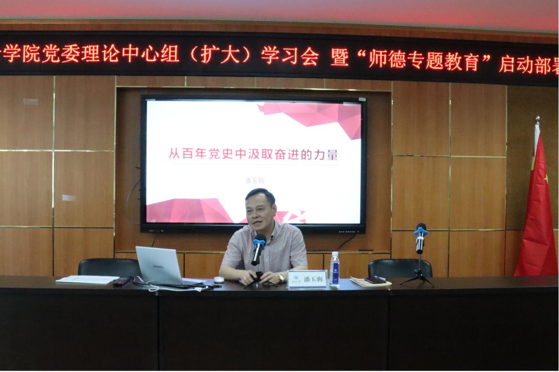 6月16日下午,校党委委员、宣传部部长潘玉驹教授以《从百年党史中汲取奋进的力量》为题为万象城官网师生党员上专题党课。潘委员从中华民族的历史史册开篇,带我们重温半条棉被、抗日英雄杨靖宇等党史故事,回顾中国共产党传奇的建党历程,指出我们党的光辉百年,是矢志践行初心使命的一百年、是筚路蓝缕奠基立业的一百年、是创造辉煌开辟未来的一百年。潘委员强调,中国特色社会主义进入新时代,中华民族伟大复兴曙光在前、前途光明,但也面临着严峻挑战,在这个关键当口,全体师生要以史为镜、以史明志,增强历史自觉,激发为实现中华民族伟大复兴而奋斗的信心和动力,做到“六个进步”,以昂扬姿态奋力开启全面建设社会主义现代化国家新征程,以优异成绩迎接建党一百周年!