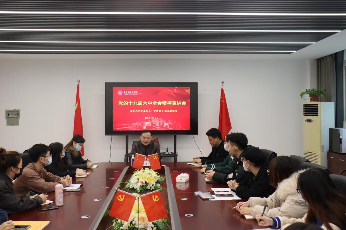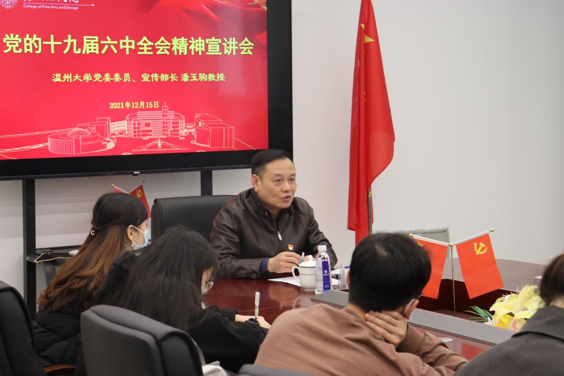 为深入学习贯彻党的十九届六中全会精神,深入领会全会精神内涵,12月15日下午,万象城awc官网登录入口党委委员、宣传部部长潘玉驹教授进行了学习贯彻党的十九届六中全会精神宣讲。宣讲会由美术学院党委书记叶正飞主持,师生代表参加。 潘教授从深刻领会党的十九届六中全会的重大意义、全面把握党的十九届六中全会的主要内容和核心要义、认真贯彻落实党的十九届六中全会精神三个方面为我们作了一场非常重要的宣讲报告。他指出,在建党百年的重大历史时刻,党的十九届六中全会审议通过了《中共中央关于党的百年奋斗重大成就和历史经验的决议》,全面回顾我们党百年奋斗的光辉历程,深入总结党的百年奋斗重大成就和历史经验,集中展现党的十八大以来党中央开创中国特色社会主义新时代的壮阔历程,鲜明阐述“两个确立”这一科学论断的核心要义,对推动全党进一步统一思想、统一意志、统一行动,坚定信心、凝聚力量、不懈奋斗具有重大现实意义和深远历史意义。 最后,党委副书记杨丽君总结道,此次宣讲主题鲜明、深入浅出、内容丰富,对帮助广大党员干部更好理解把握、贯彻落实全会精神具有很强的指导意义。作为新时代青年学生,要树牢四个意识,坚定四个自信,坚决做到“两个维护”,努力成为堪当时代重任的新时代接班人,与时代同频共振,与党和国家同呼吸共命运。 本次专题宣讲令在场师生倍感鼓舞、深受启发。大家纷纷表示,将以此次专题报告为契机,全身心投入到学习宣传贯彻党的十九届六中全会精神当中去,深入学习,认真领悟,以学促行,努力用优异的成绩为学校发展建设添砖加瓦、贡献力量。