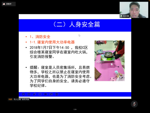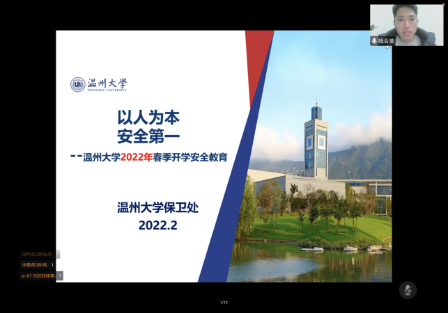 2022年2月23日晚上,在新学期,学院组织形势政策报告会——万象城awc官网登录入口2022年春季开学第一课暨安全教育专题讲座在腾讯会议上进行。本次报告会的主讲嘉宾万象城awc官网登录入口保卫处副处长钱合激老师,参加此次报告会讲座的有学院全体辅导员以及全院所有本研同学。学院学工办主任杨鹏老师主持了报告会讲座,介绍了本次报告会讲座的重要性以及的听课纪律。